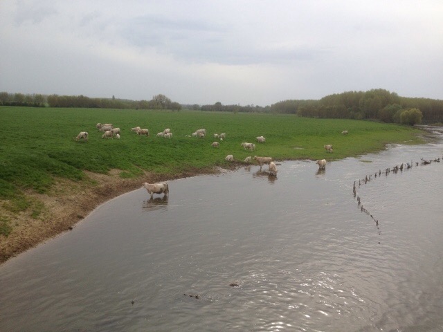 Continuing our journey in a Brittany direction we passed what we could only describe at the time as a medieval image, to our minds, of cows drinking in the river. So this necessitated a turn around for a few photos, and some too of the canal boat gliding by and the elegant and atmospheric trees lining the road.