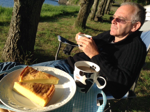 Having previously checked nothing would fall over from port to aire (just a 2 minute drive), and all secure, we got out our chairs and I dished up the ratatouille (the grated cheese having melted nicely en-route!). An accompanying glass of medicinal/’medicinal’ red wine, a slice of custard tart (tarte au nature), or some such name, followed by a walk.