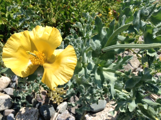 As we walked along the wonderfully user friendly coastal path we passed majestic granite rock formations, and cobble stone beaches ‘decorated’ with smatterings of various shades of green from wild sea spinach and sea holly (the latter, in a pretty yellow bloom), a first sighting for me!, for both of us I suspect.