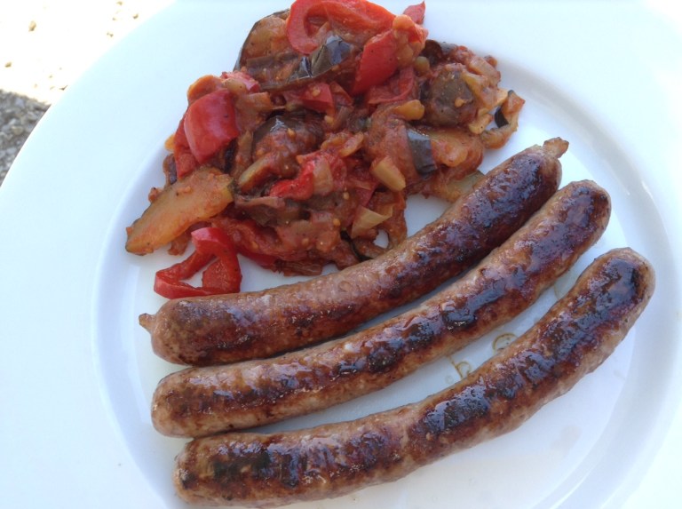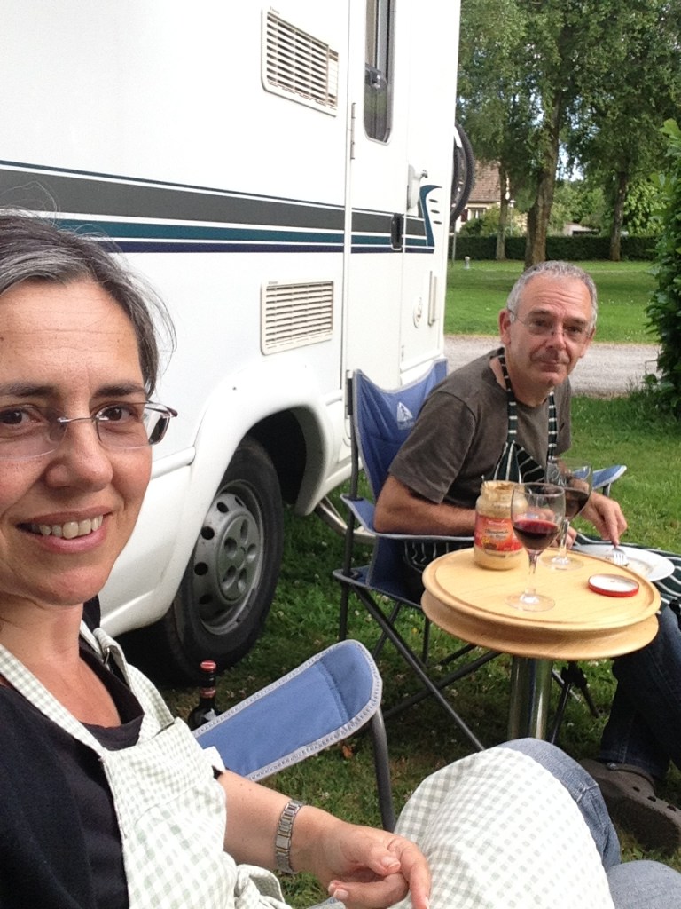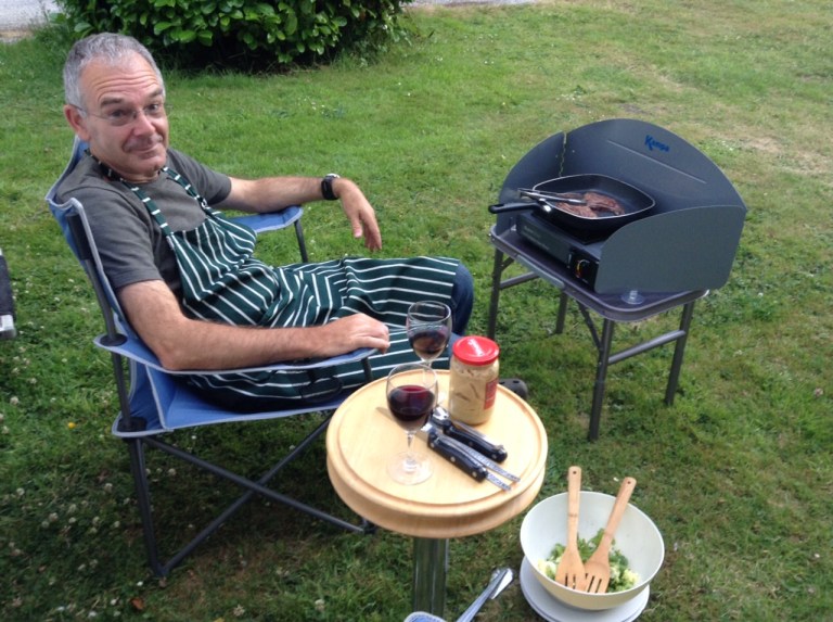 I had prepared some ratatouille which went very nicely with some sausages. We are very delighted with our pieces of camp cooking kit – our single burner gas hob which uses the hairspray size canisters, our ‘Kampa’ stove wind shield, and great little folding table – all seeming like they came together!