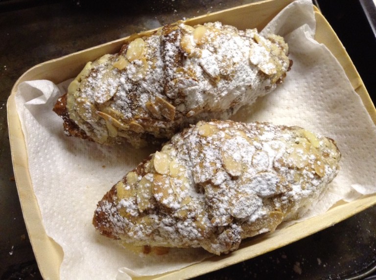 Croissants aux Amandes! Our friends will be excited to hear how easy these are to make! I researched it on the Internet being curious! These I made – well, part made! I won’t say anymore or I’ll have to reveal the ‘magic’ to making them, and I want to wow them first!! They’re delicious!!!