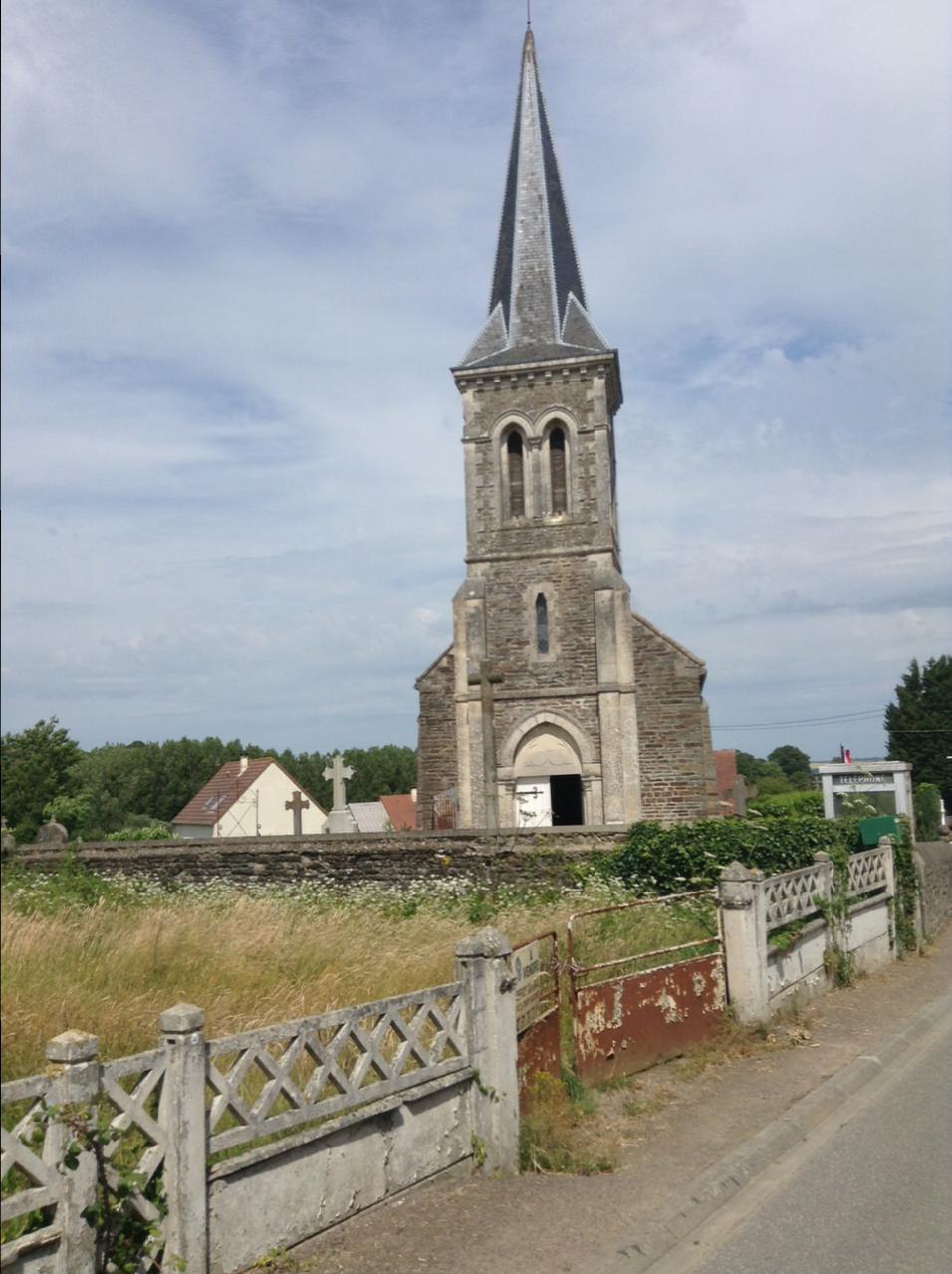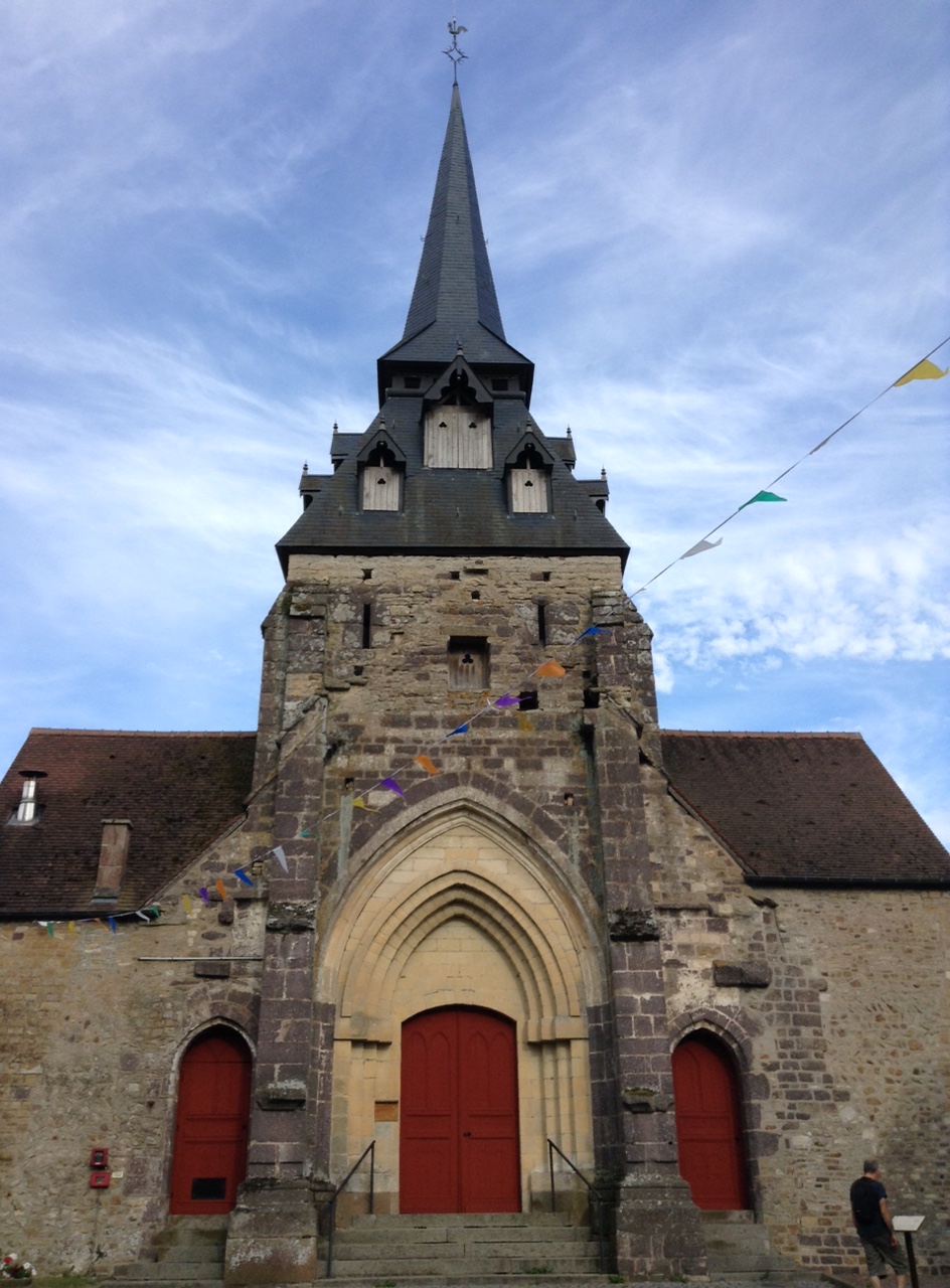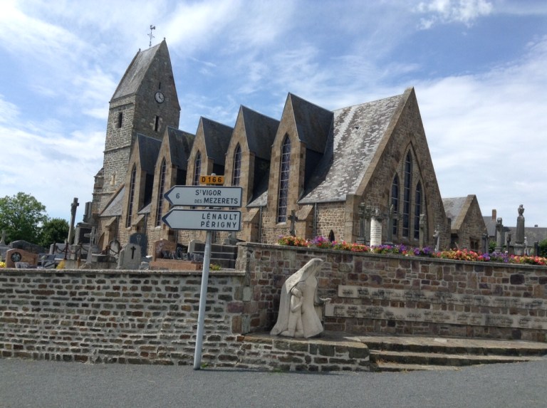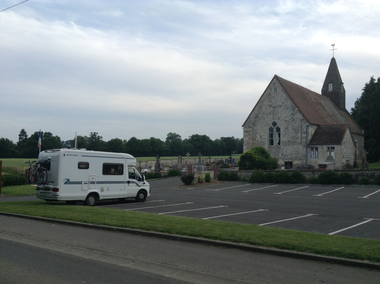 After driving through more picturesque scenery, and having no success staying at the Aire in Clecy what with the travelling fayre in town, we travelled on and decided to stop here in the church car park at Pierrepont for a convenient wild camp!
