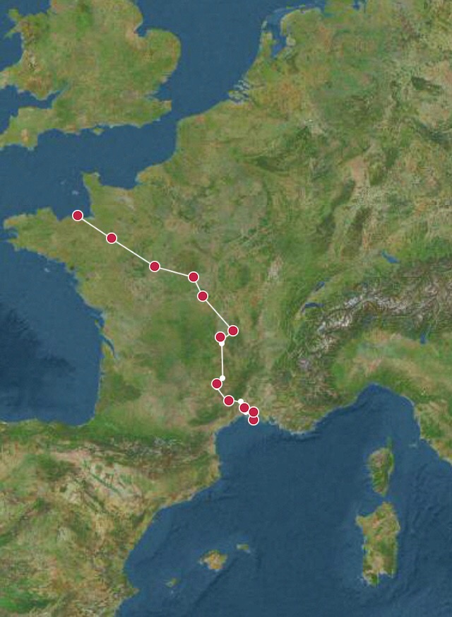[Thanks to the Polarsteps app I’ve “back-filled” our “as the crow flies” route to the Med – M]: