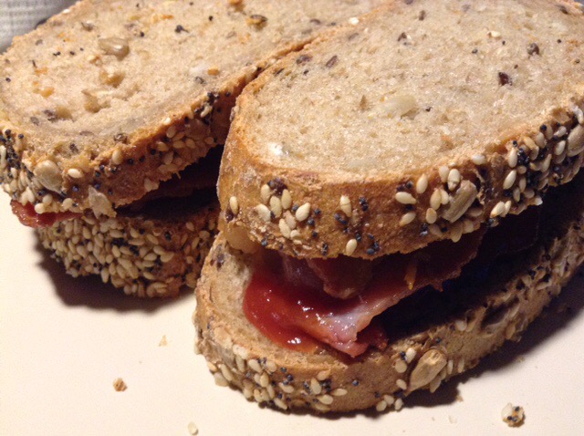 After we’d checked out the beach in the freezing cold Mistral! – it was time to cook up a nice comforting bacon sandwich! We love the seeded loaf from Lidl – makes it a half healthy sandwich! We buy that most often. The bacon was in our fridge at home, so came with us!