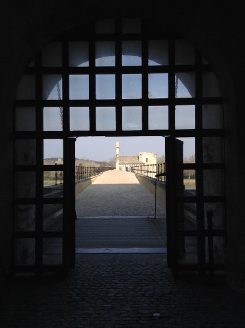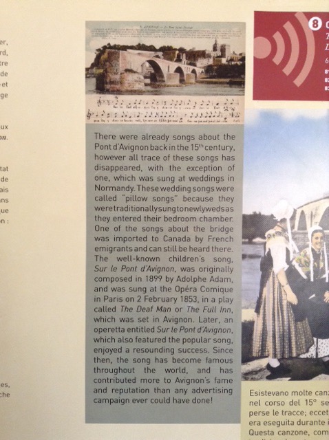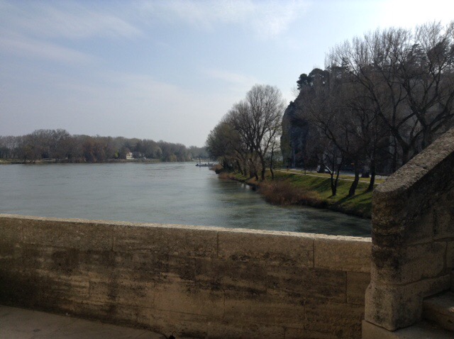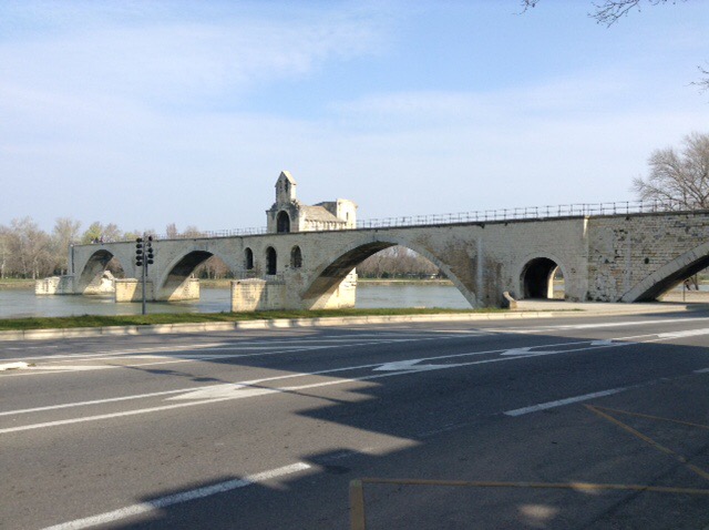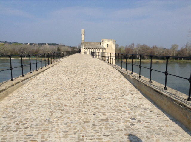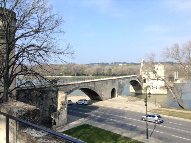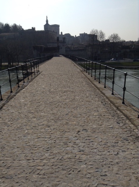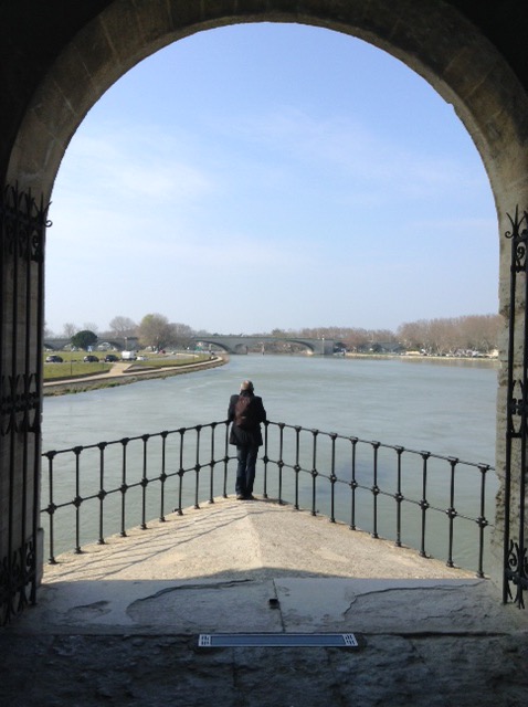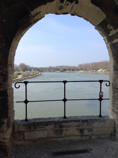 The next day we headed across the modern day bridge (thankfully no extreme wind, so no need to hold our specs!) and walked across to the ticket office for THE old bridge of Avignon. Michael thought it would be good to actually walk on it – it has after all, to all of us, been a name spanning back to our early years having all sang the nursery rhyme! We paid our entry fee and walked up and onto the old bridge which spans out half way across the river – the rest of the bridge lost over time I think due to damage from wars and it’s vulnerability to the strong river current making it difficult to repair in those ages past (but don’t quote me!). Now it is half length with a nice neat cut off point!