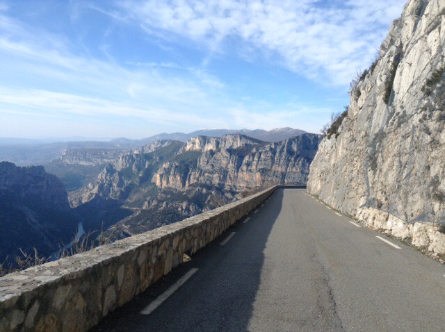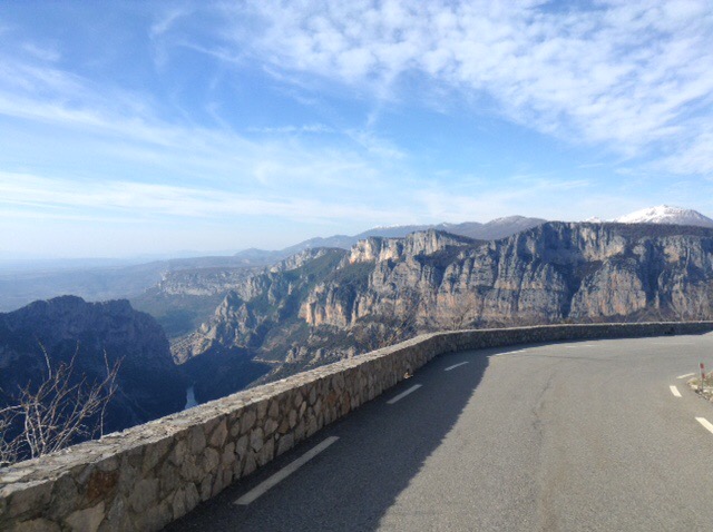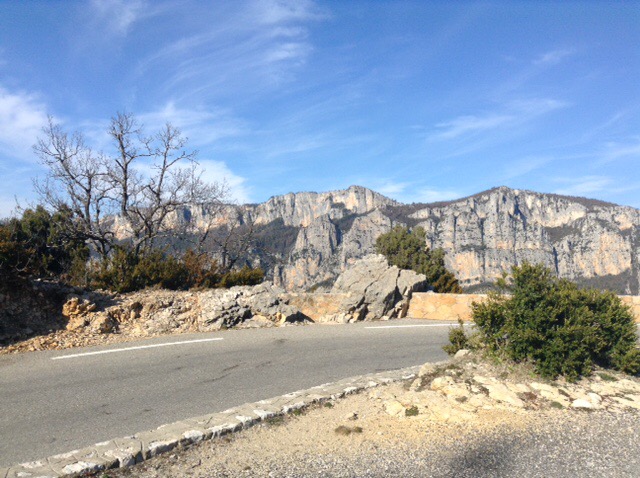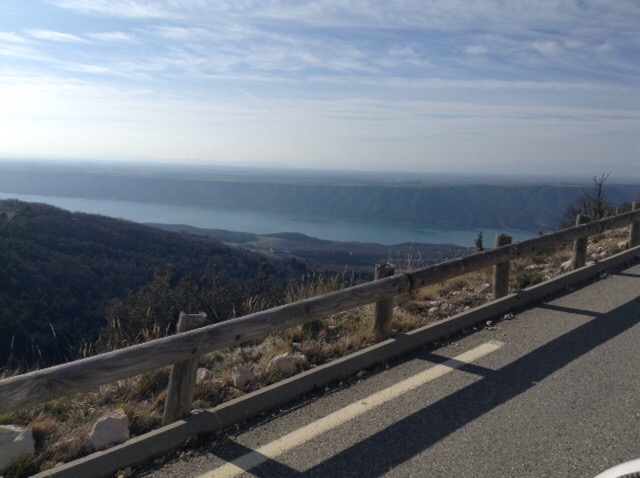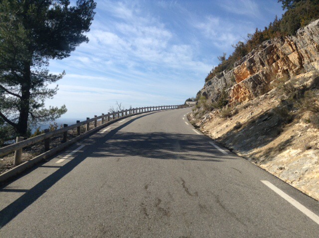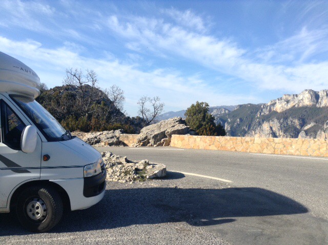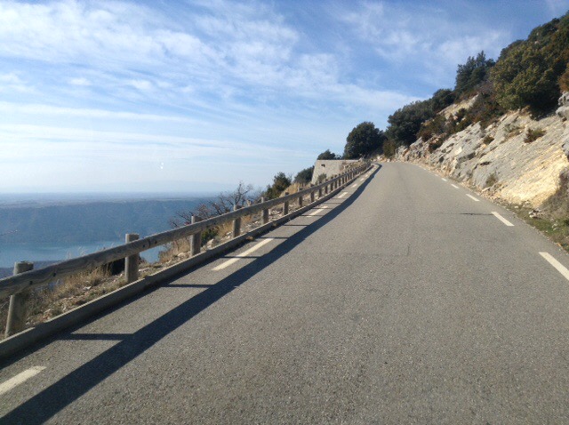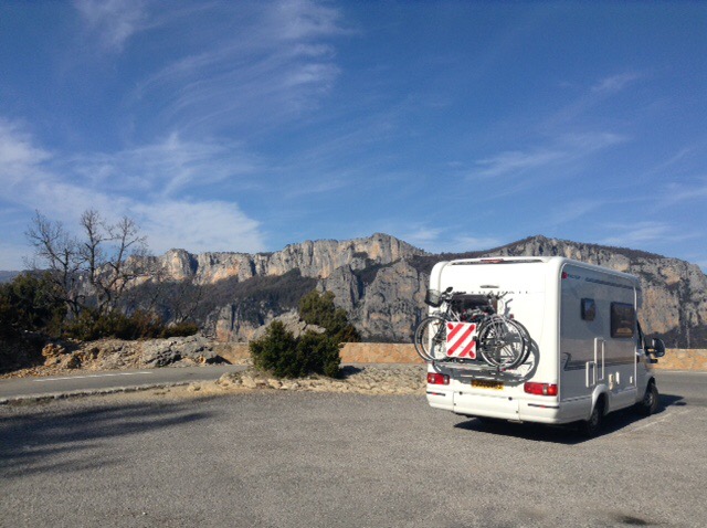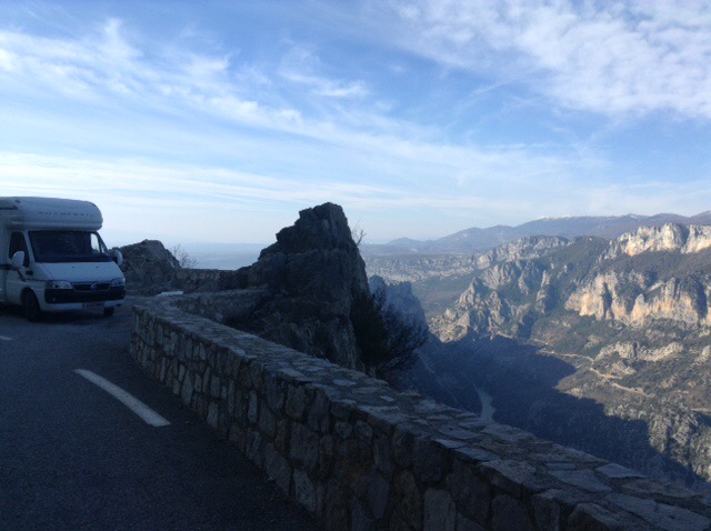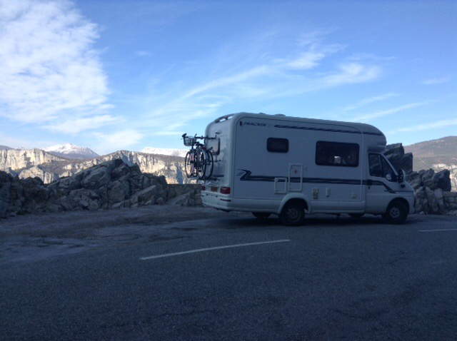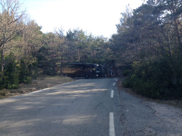The road was reassuringly well equipped with crash barriers and stone walls too giving instant confidence! The width of the road was also heartening, with no shortage of passing places, which was just as well as we passed a coach! – and amazingly the very same bronzey gold German tour coach that pulled up next to us at our scenic lunch spot outside Roussillion, with ‘SCHMIDT’ emblazoned down the whole side. We recognised the driver! – as well as the distinct coach!