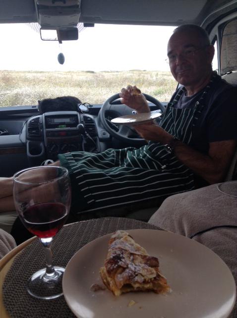 After our supper we enjoyed a stroll along the little breakwater to the small island peninsula before settling in for the night with a ‘homemade’ almond croissant and glass of cherry nectar!, but not before filling up with free water!