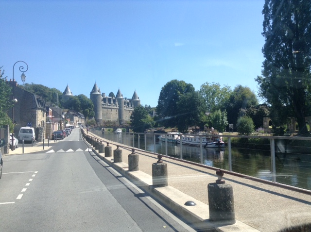 From Langourla, having had a picnic lunch on a bench by the open air theatre, we drove the 40 minutes or so to Josselin. We had spent a freezing cold New Year’s Eve with Daisy parked up by the canal there on the Talbot those years ago! Josselin we know well, and it is somewhere we’ve driven to with the girls for a bite to eat from the house before now. It seemed an obvious place to re-visit with the girls and the vans!
