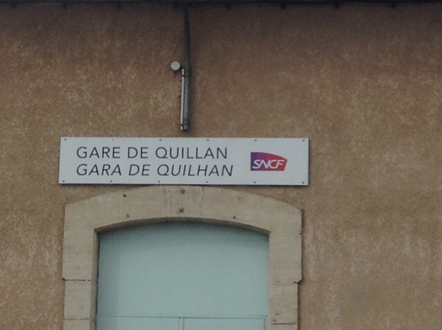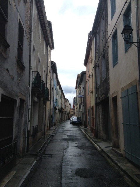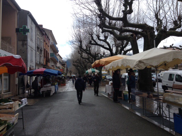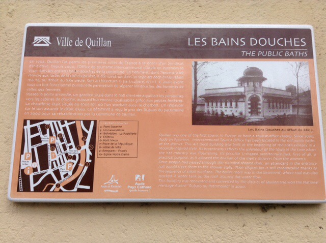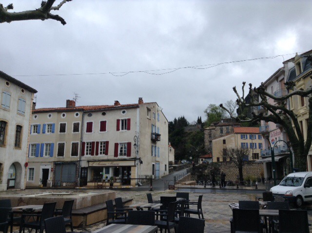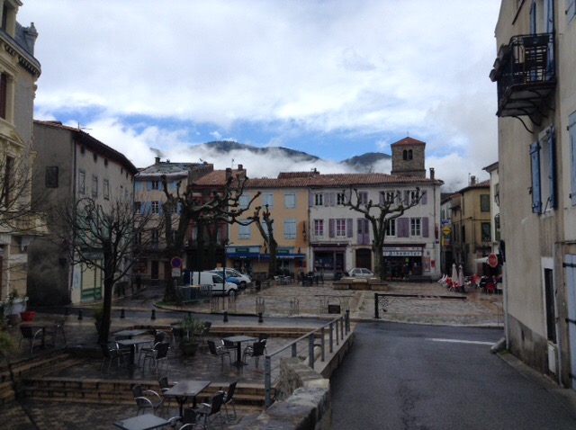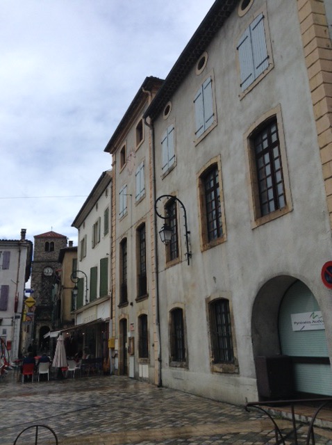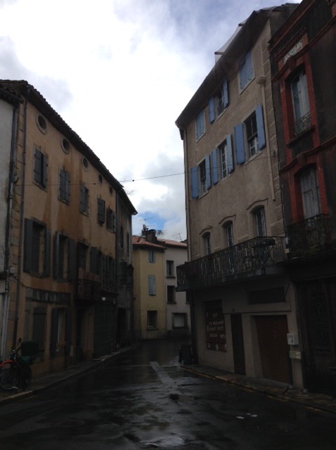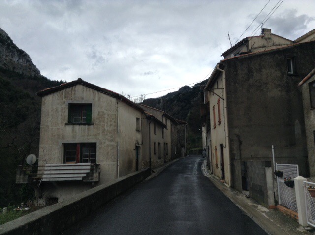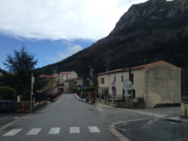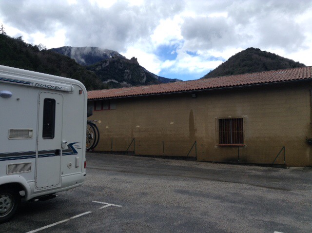 We then made the windy, damp, foggy descent into Quillan, where we dropped beneath the cloud line, although the rain persisted as we looked for provisions & fuel. We saw a sign for a Carrefour with petrol pumps pointing in the direction we were heading, so thought we’d take advantage of the free aire next to the station & visit the town given that the rain had now fully stopped and hints of blue sky were appearing.