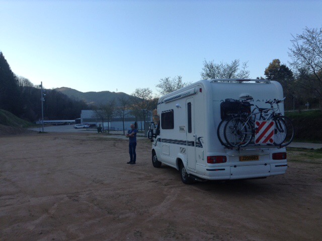 So last chance saloon was Sant Hilari Sacalm. I think we must have driven to the top of a mountain to find it. Massive carpark near to a sports centre. We’re all on our own, which is fine. There is just one niggle that that no reviewer has mentioned and that is the constant noise coming from a nearby industrial building. Fortunately it sounds to me exactly like a river running right next to us. I’m confident it’ll be like white noise, and that sleep, after such an unexpected long drive, will not be denied us.