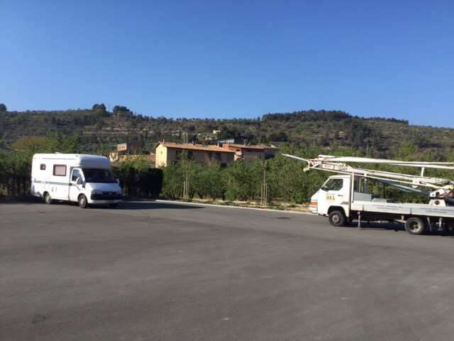 In the end Sophie encouraged me to sneak a peak subtly out the curtain at the front. This was actually a truck and cherry-picker and it was dismantling the very tall lighting pole next to us. It was decided that I had therefore better get dressed & move pronto. I did this and the man in charge came over and indicated that they were going to be working on 2 of the lights & so could I now move again a little the other way. Anyway, all was fine, but Sophie was keen to keep the roof blinds firmly shut given the presence of men up a cherry picker.