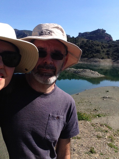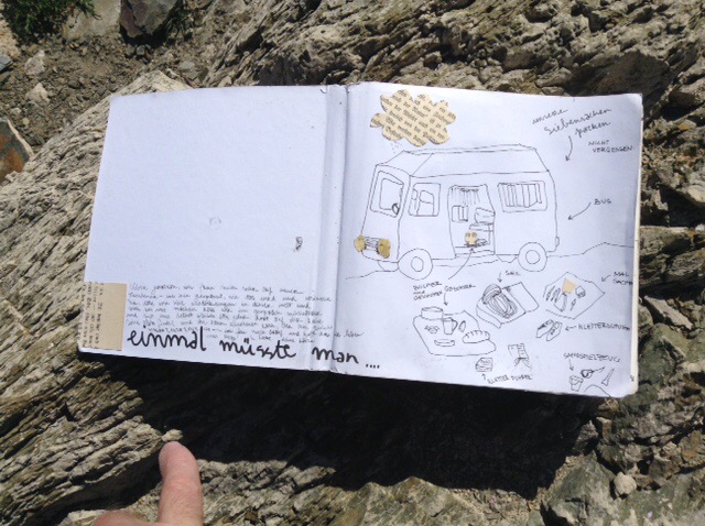 Having made an early start, we were hungry earlier than usual and so devoured our fresh Spanish barras with soft cheese and grapes down near the lake/reservoir. After lunch Sophie noticed someone’s intricate notebook including drawings, writings, and details of climbing routes abandoned on a rock on the shore. She was determined that this precious work should be returned to its rightful owner. Easier said than done, but she had a word with a Dutch chap, Aad, in a 42 year old converted Mercedes van/truck, who had a few ideas as to who it could possibly belong to and he said he’d hopefully let us know in due course. She left our card with him hoping to hear back at some point of a happy outcome.