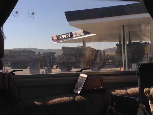When we arrived at the service station we notice a few army chaps around, and before long they had completely commandeered the petrol pump area. There must have been a dozen or so trucks, each towing a couple of tanks. They then thundered out and right past us. Quite an unusual experience, and Sophie took a few surreptitious photos and a video for the record.