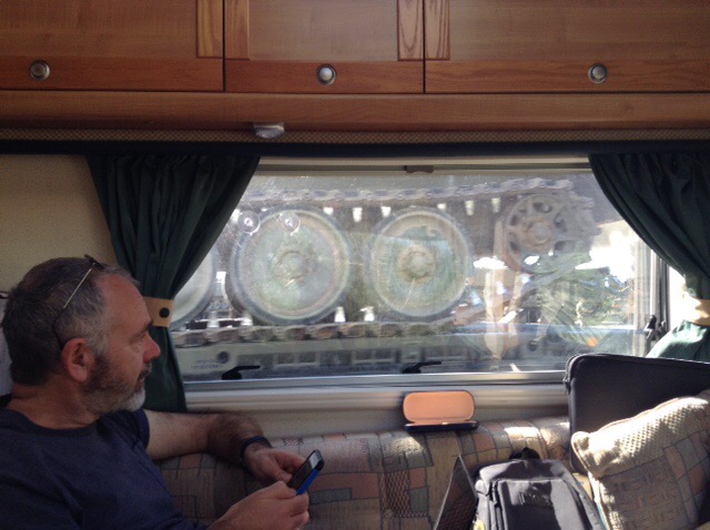 We then had a planned break in a service station, where we checked emails, bought our bread, and topped up our Autogas/GLP. In hot weather we get even more mileage from our refillable gas as we’re not using the heating, and in the meantime the fridge can stay on 24/7, which is particularly important when ice-cream is an essential.