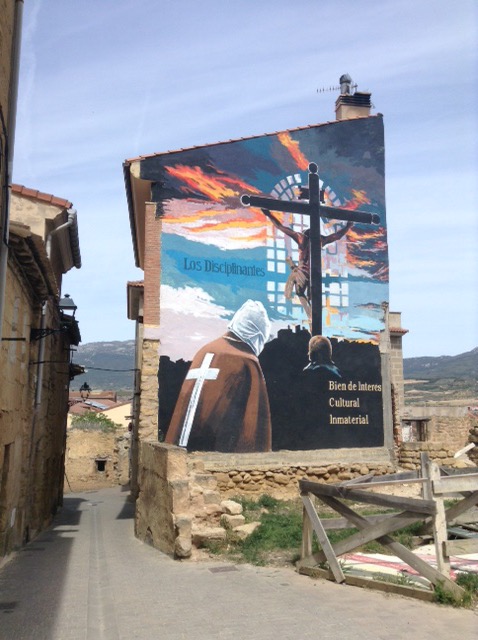 Not yet having eaten today, we were delighted to see someone with a barra loaf & so hunted down the bakers. We found one but interpreted the sign on the door as saying they were away for their holidays. We went in the butchers/wine shop next door but couldn’t see any bread so headed out smartish before anyone could ask us a difficult question in Spanish. Still determined to find our barra, we went into a sort of sweet shop plus, where the chap sent us back to the butchers, and sure enough they had some “under the counter” bread. In case you might be interested, in the butcher’s window they had little models of the people who whip themselves.