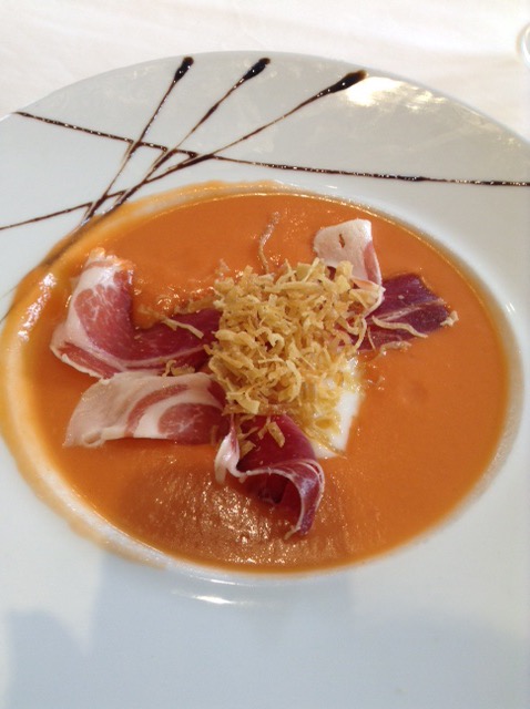 Anyway, the food turned up and I was delighted with both starters. Lentil soup with chorizo, and a lovely gazpacho type cold tomato soup. I lost the lentil soup to Sophie, but was given a spoonful or two at the end, but minus the chorizo, which I’d been particularly looking forward to.