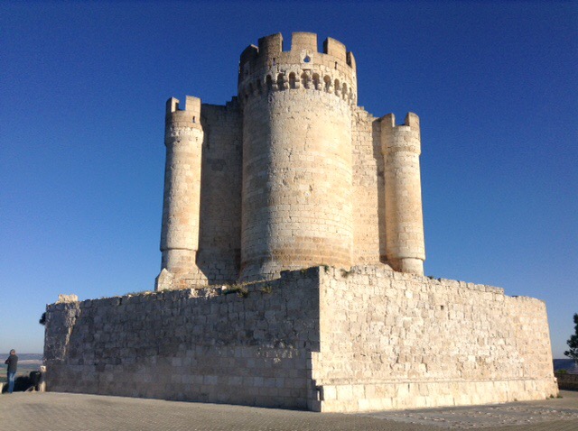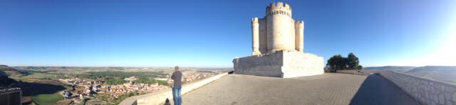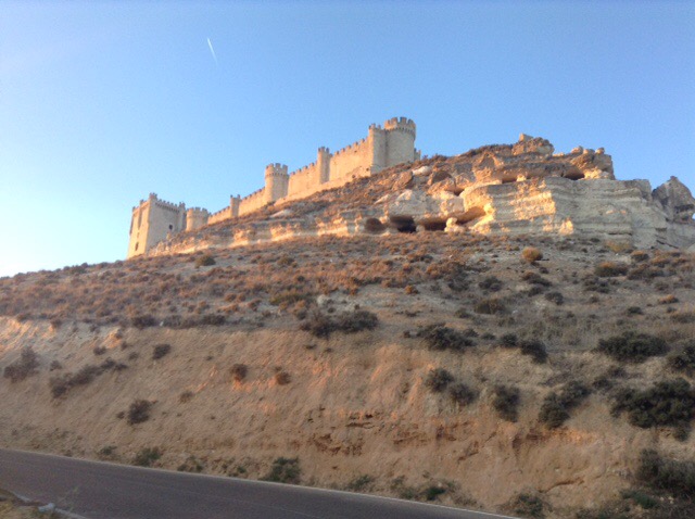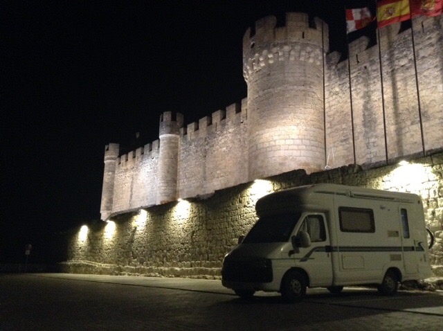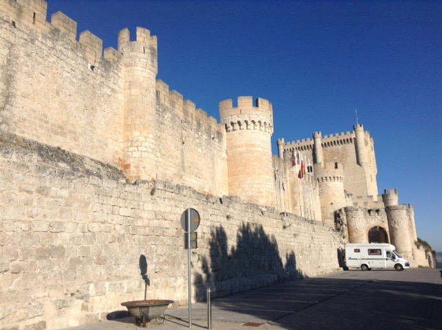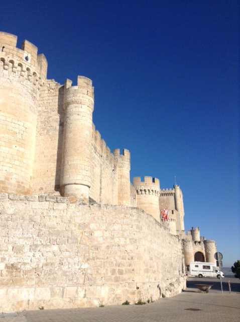 The lighting from the slowly setting sun was amazing and the scenery very nice indeed as we drove along with one eye on potential places to overnight. Sophie found a green area near a village, but I wasn’t keen on that one, so we persevered on our tour and search. We finally came to the incredible castle at Penafiel that towers at a very high point over the town. The Satnav was determined to take me down some ridiculously narrow streets, so I ignored her and assumed that we’d only be able to take a few photos and then be on our way.
