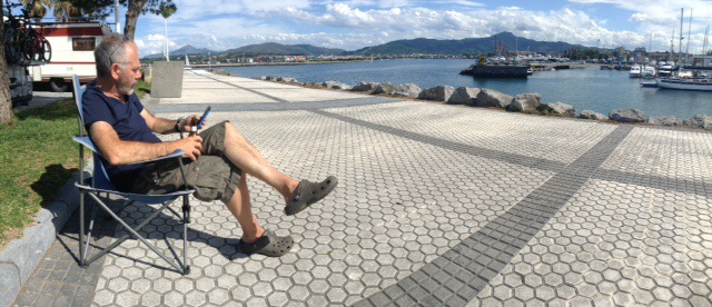 It’s a Saturday, so we expected a big take up here of family motorhomes. There must be at least 100, but we’ve gone as far down the pier as possible and have tried to mitigate the risk of loud family disturbance, but let’s see how things pan out. At worst, we can always move, or put on the Gypsy Kings at an appropriately loud volume to drown out the locals.