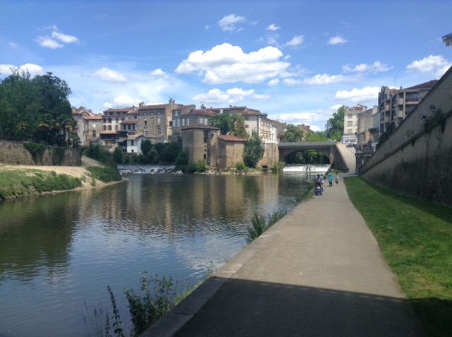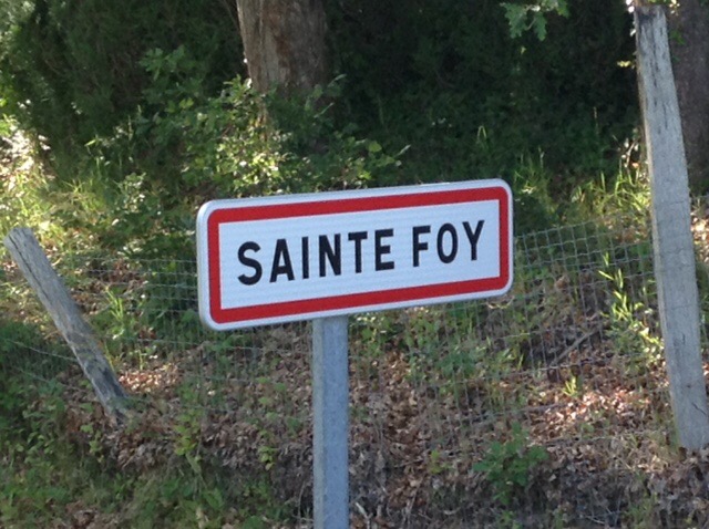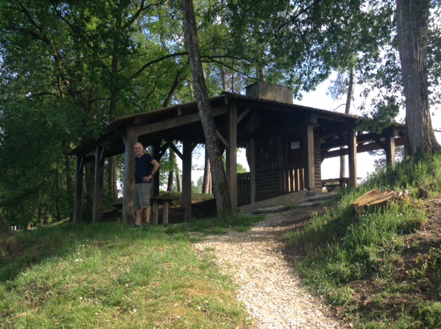 So we stopped at the very green and rural lovely Park4night picnic spot at Sainte-Foy, having to sit out in the shade to cool off. Hoping to eat out tonight I restricted my late lunch to a pain au raisin, a small rice pudding, and a coffee. Sophie, on the other hand went for the full French cheese and baguette lunch, and will wonder why her capacity for food will be less than usual later, but that just means more for me.
