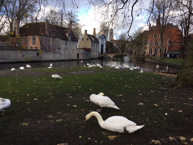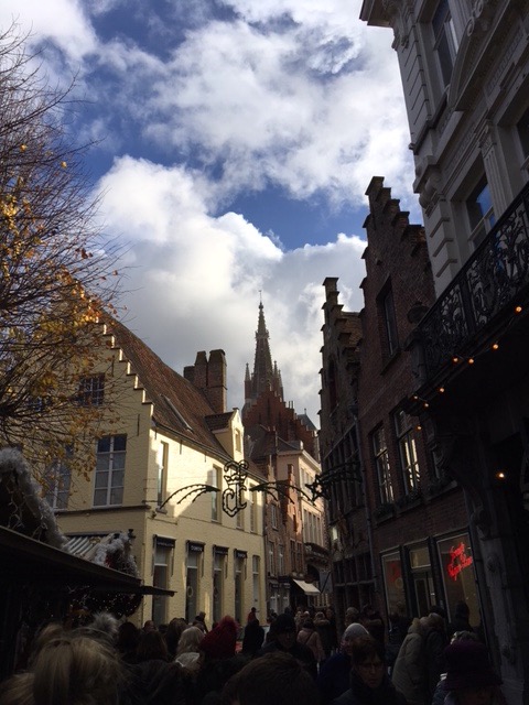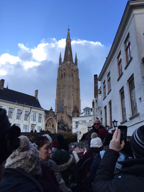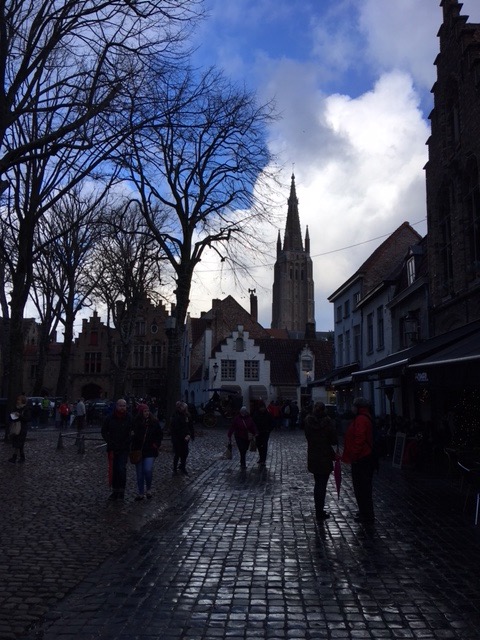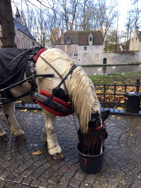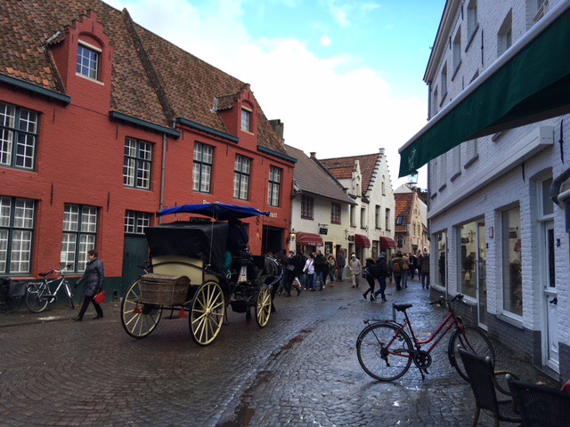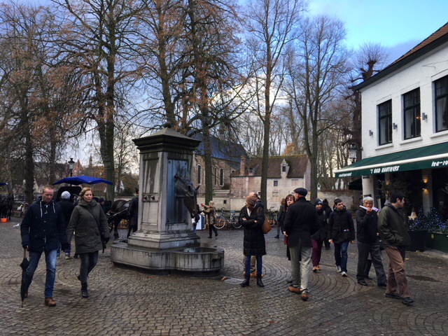 The next day, after a late start, we returned to the town to see Bruges in the daylight. There’d been some intense downpours during the morning, and so we went prepared, but had no rain at all during our afternoon visit. It was much busier on this occasion, with virtually no room on the pavements, which meant vying with the traffic, horse-drawn carriages, and bikes.