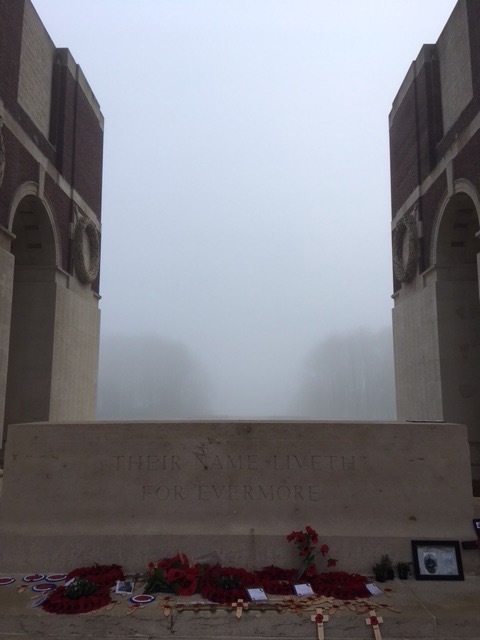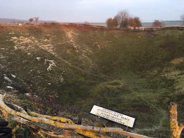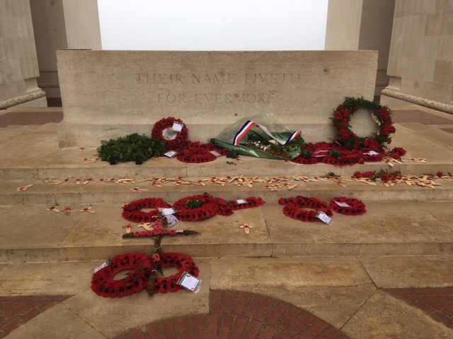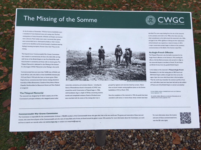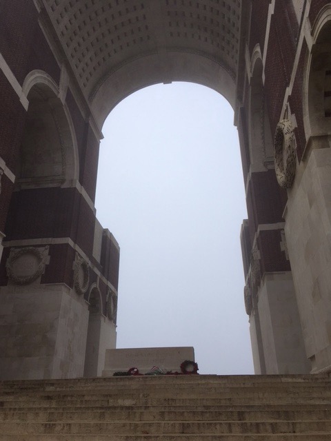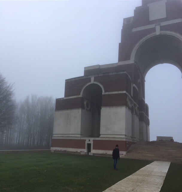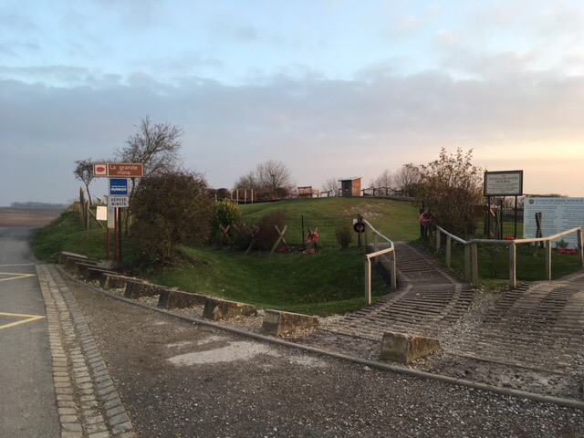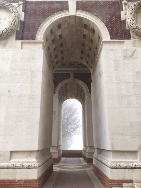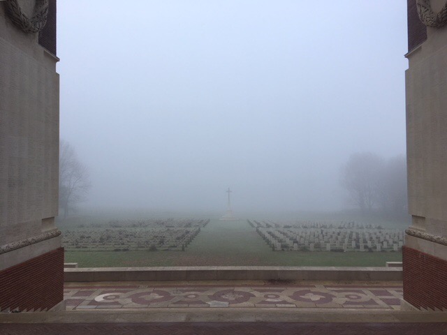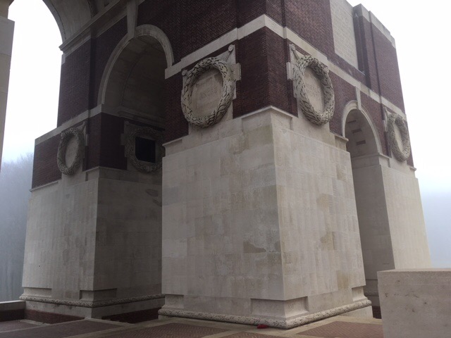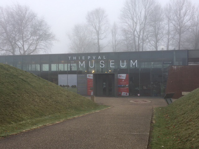 Our first visit of the day was the famous Thiepval Memorial for the Battle of the Somme. We’d seen this imposing monument from some miles away yesterday, but in today’s fog, we couldn’t even see it from the car park, or even after going through the reception area. It’s certainly impressive, but in sub-zero temperatures we didn’t linger.