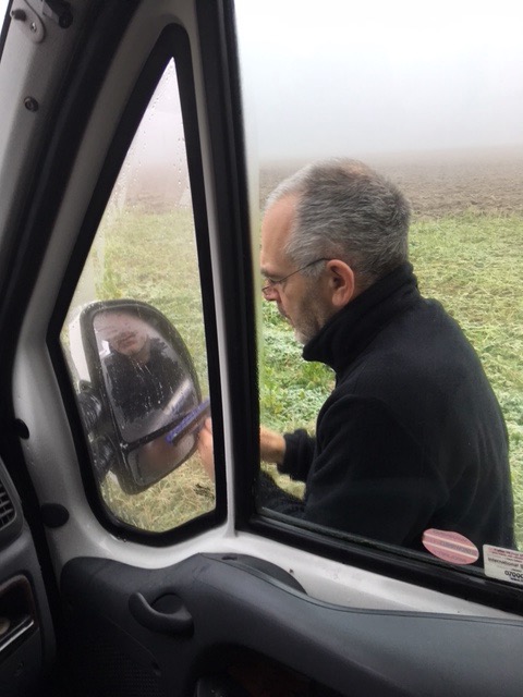 The forecast was a low of -2C during the night. When we woke it was -3C outside and thick, thick fog. We kept the heating on all night on a low setting and were very comfortable. Outside even the cobwebs on our underused bikes had frozen. The forecast for the day was a -2C start, rising to 0C by lunchtime and +2C later, which has pretty much been right, but with most of the day at 0C.