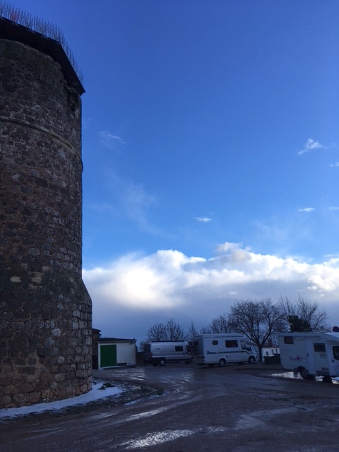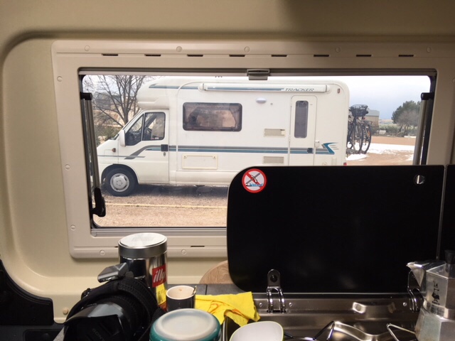 What did surprise us was that there was snow on the roads and covering the ground, which was something we hadn’t seen all day, despite the persistency of the snow showers. So we hunkered down with a couple of other motorhomes, and another surprise was recognising a Belgian van we’d parked next to a week ago, over 250 miles back. They’d gone East to the coast in the meantime, whilst we explored the mountains. So that was something of a coincidence.