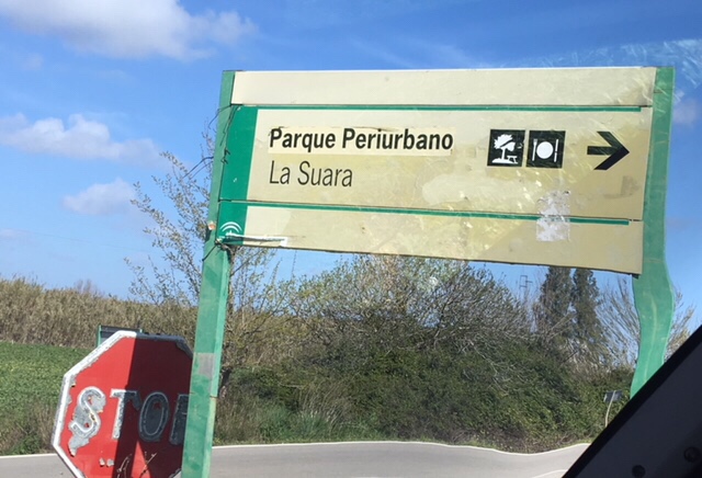 11570 Jerez de la Frontera”, but a long way from Jerez in fact). It’s actually the parking area for the Parque Periurbano La Suara. The only description was “Zona recreativa la suara barbacoas sitio trankilo se puede pernoctar muy trankilo ideal pasear o bicicleta”. Now my Spanish is rubbish, but from what I could decipher, plus the lone photo, it looked ideal, ie large hard-standing area, with a motorhome showing. There were no reviews, which you could interpret either way, so we’ll have to see if we survive the night. We have two neighbours, which is always reassuring.