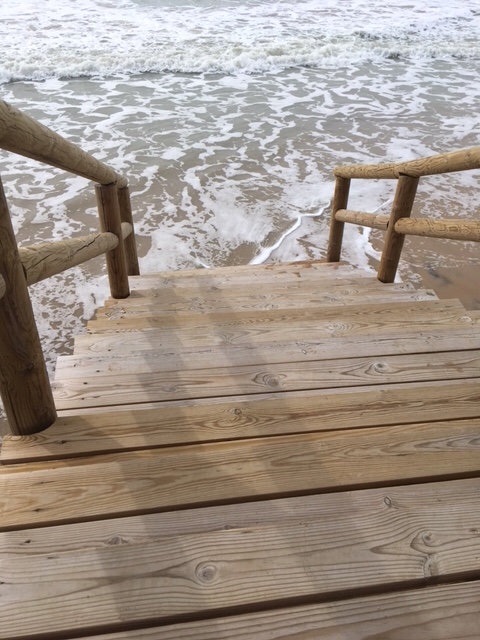 We’re on the Atlantic coast, and enjoyed a sit on the wooden steps overlooking the high tide, then a walk on the beach. It’s a comfortable 20C here and a very nice temperature.