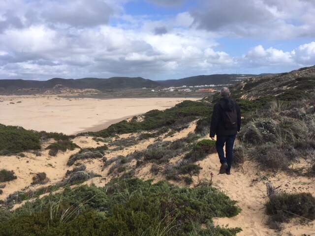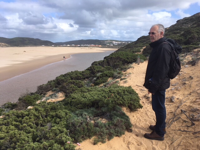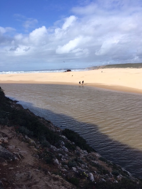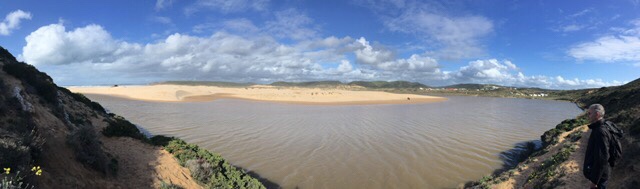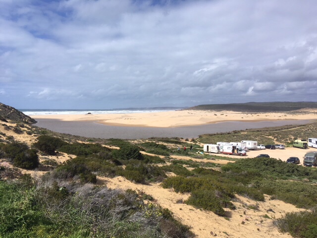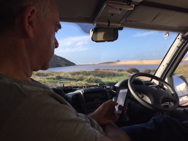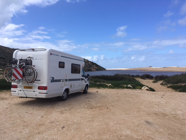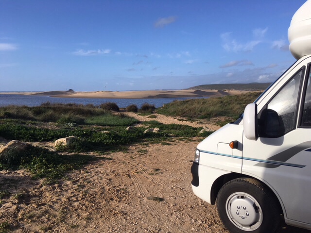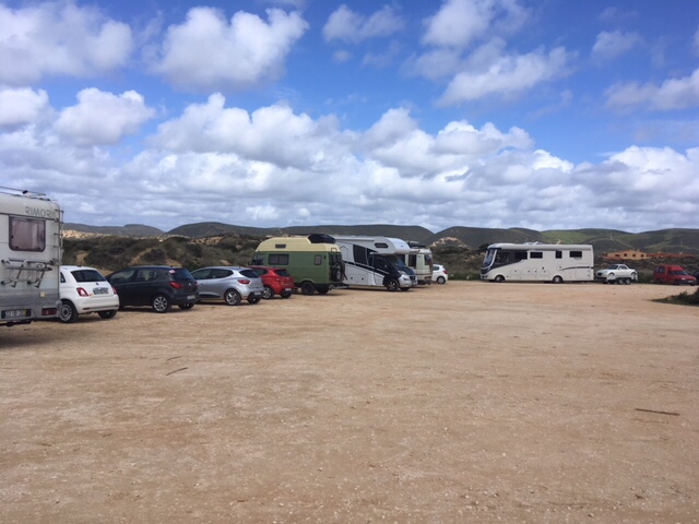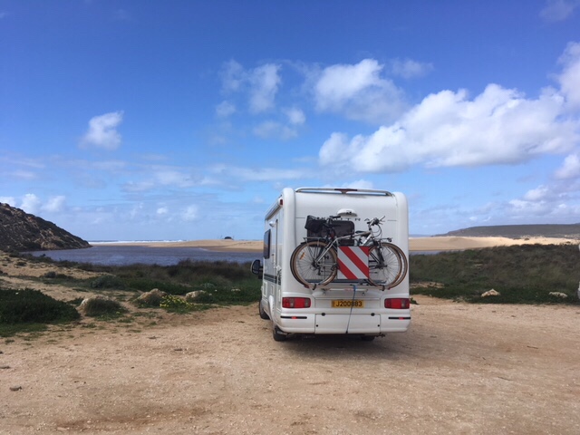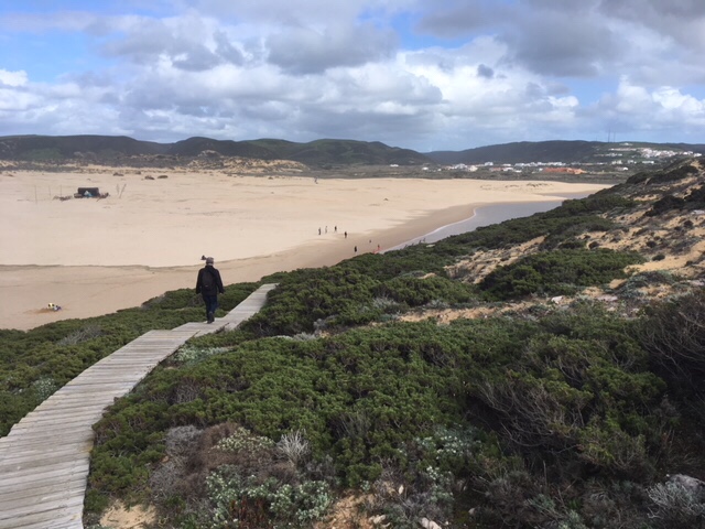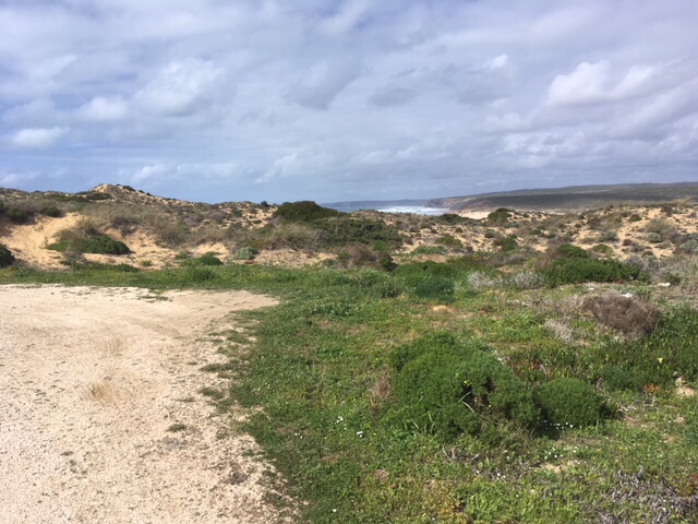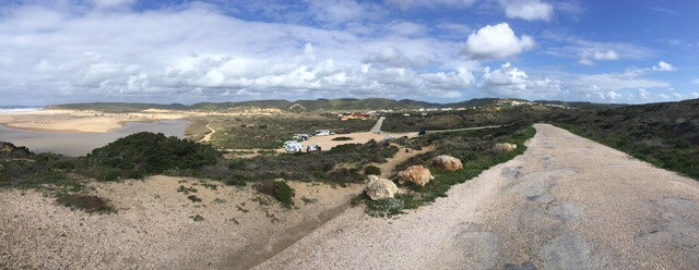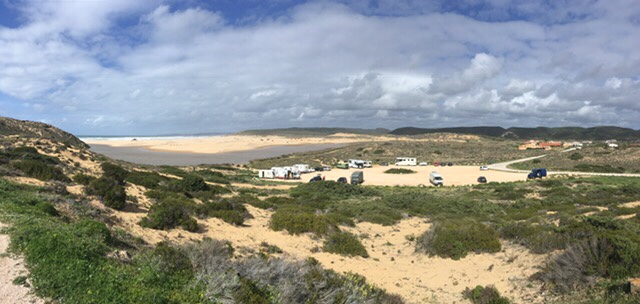 After a Lidl top-up we began to enjoy the simple roads and countryside of this wonderfully underdeveloped part of the country. Very soon we were at my chosen Park4night at the Praia da Bordeira at Carrapateira (Estrada da Praia). The reviews looked great and the place surpasses those reviews. We parked overlooking the lagoon, with miniature Sahara-like dunes on the beach beyond, and the massive restless surf beyond.