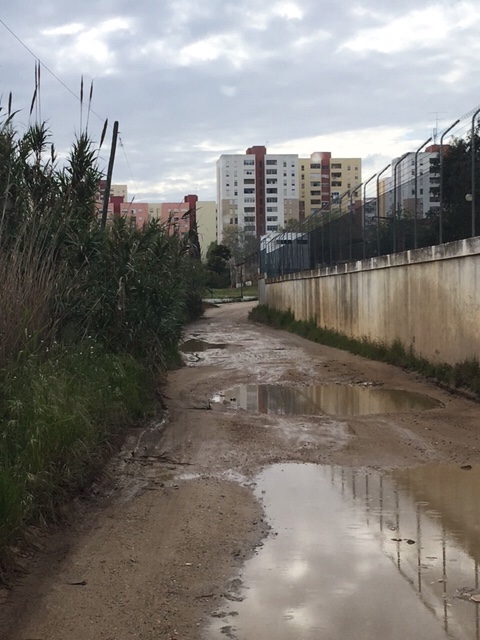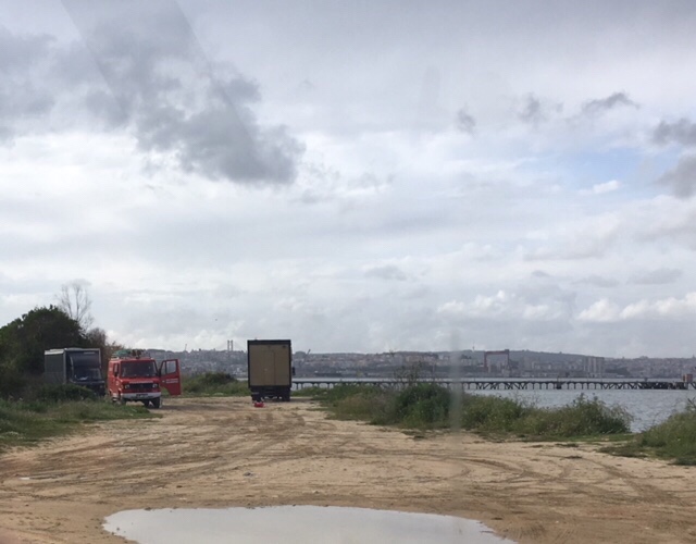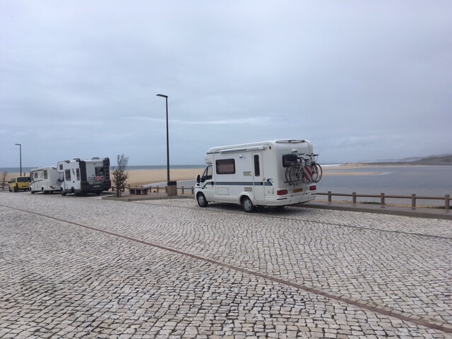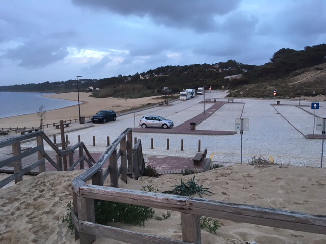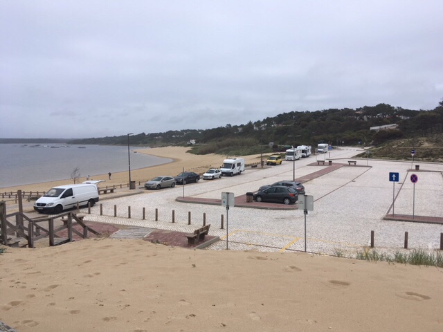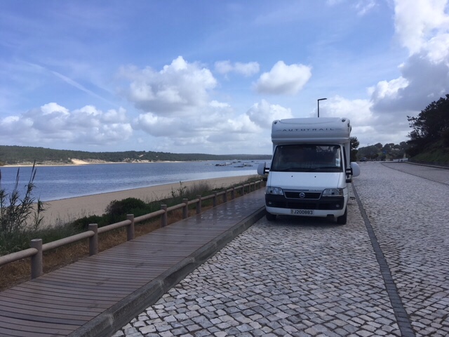 First obstacle was the vast urban sprawl of Almada, where there was more highrise accommodation than I think I’ve ever seen anywhere. SatNav lady was insisting on taking us through a naval base, so after a few abortive attempts, I guided her to take us a more plausible route. This was the only possible way to reach my well-rated overnight spot, but the muddy, pot-holed road, that made our earlier beachside potholes pale in significance, soon had someone’s blood pressure rising.