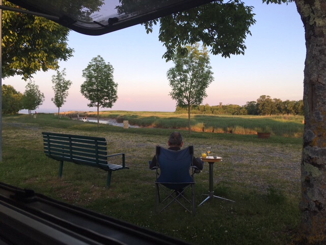 Tonight, our Park4night is at Port de By, a tiny tree-lined port, with a distant view of the North bank.