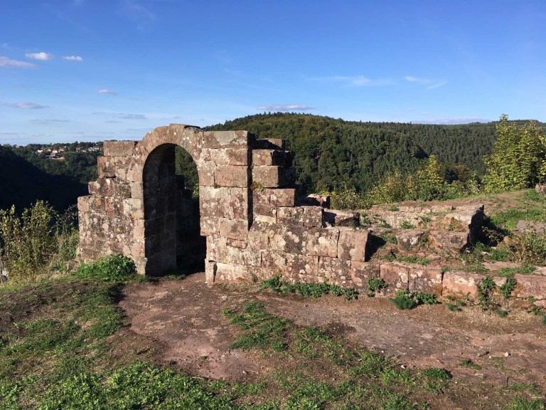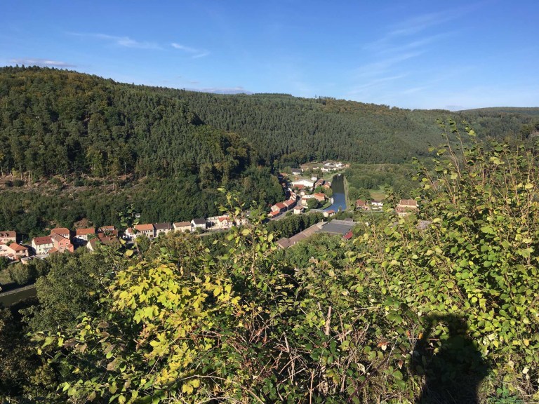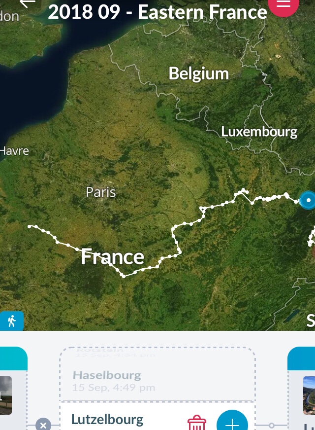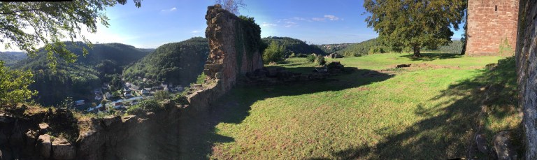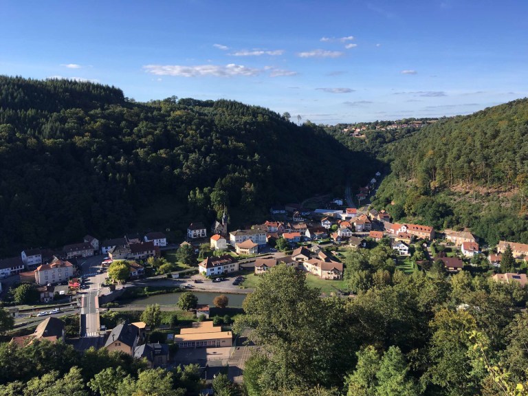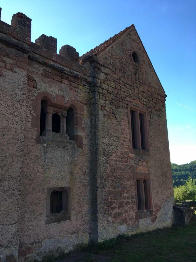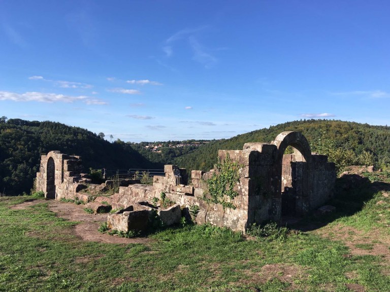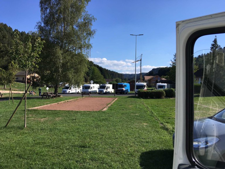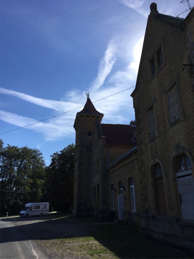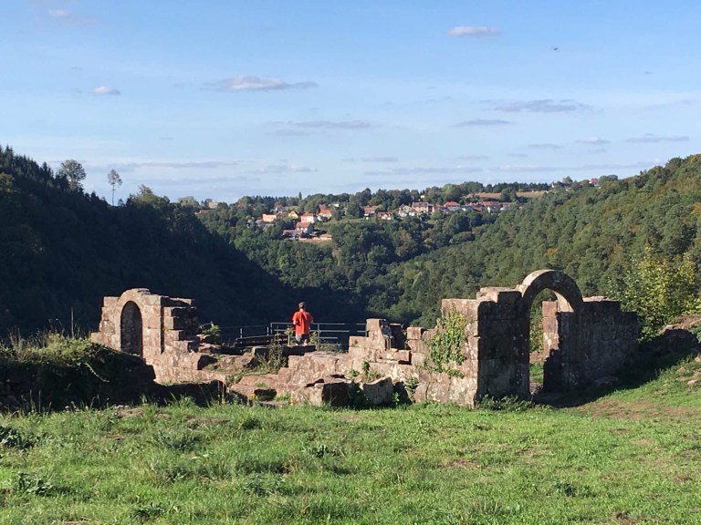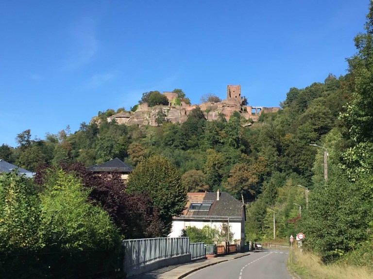 Then we came across the town of Lutzelbourg, above which there loomed some castle ruins. Sophie suggested that we might find we could overnight up there. Whilst this is not in her job description, a Park4night spot did actually appear on my SatNav, so we thought we’d better check it out. The approach road looked a bit tight, so we walked it first to see. Comfortable that we could drive up it and that there was sufficient space to park on the flat, I left Sophie snapping away with her phone, whilst I went and fetched the van. It was a stunning spot, with great views from the castle, and we looked forward to another peaceful night.