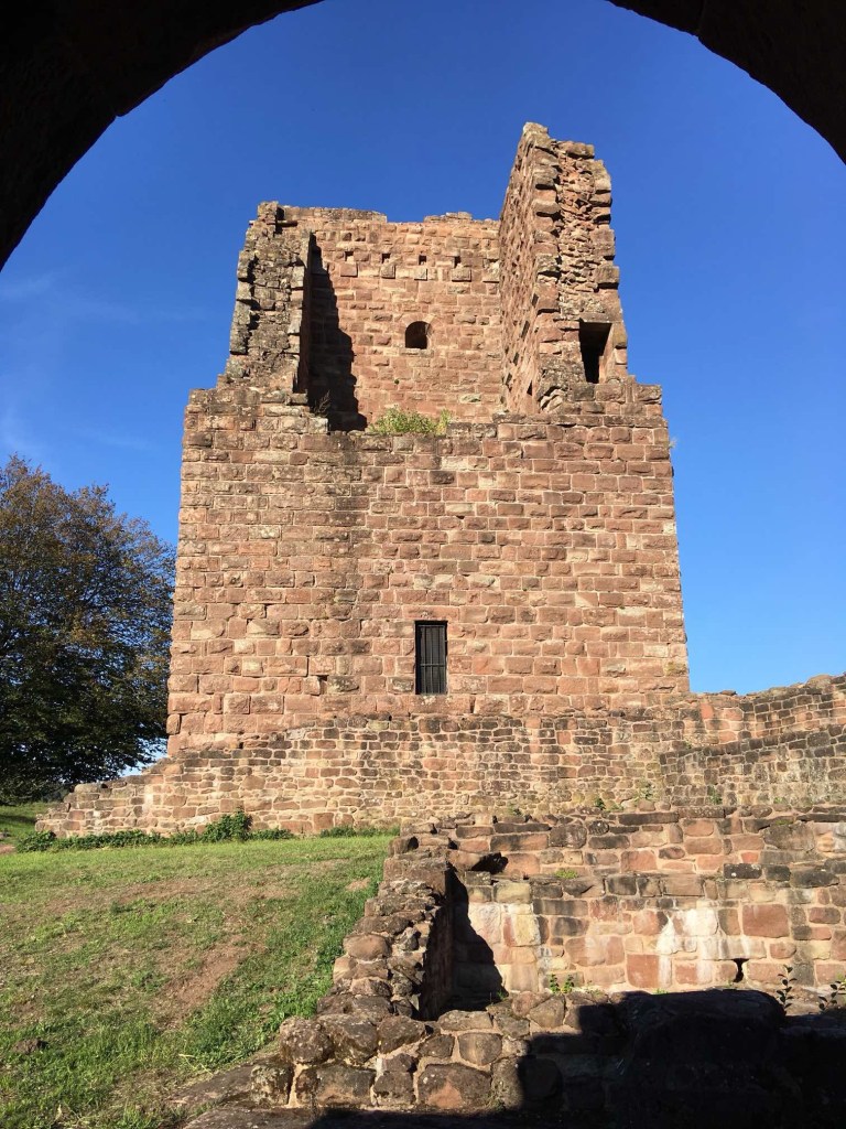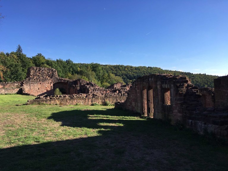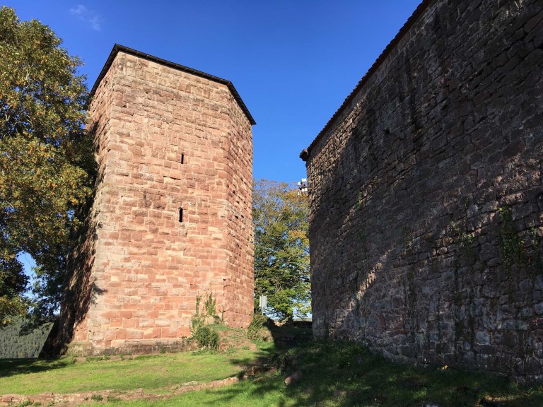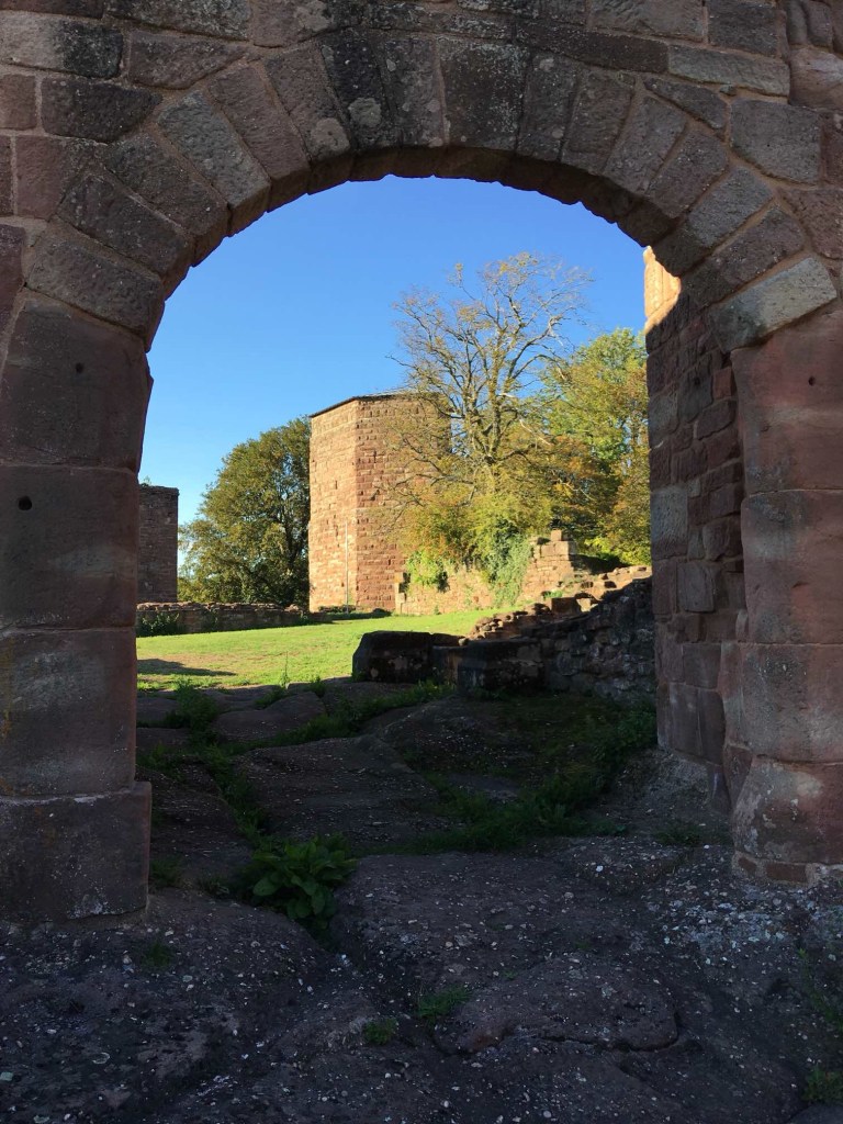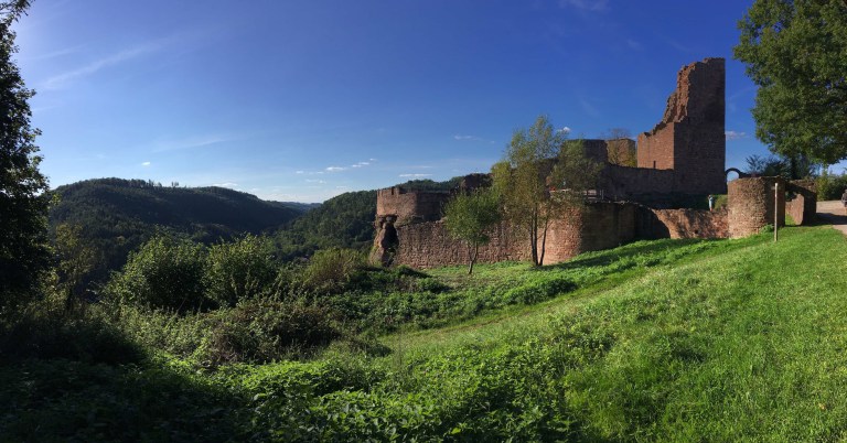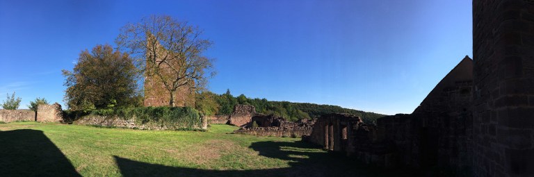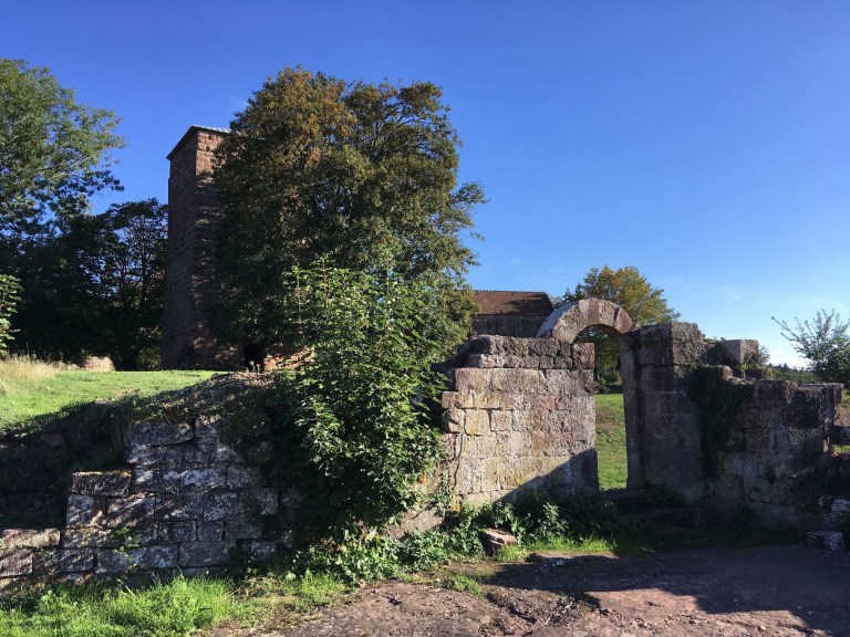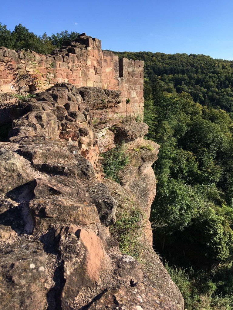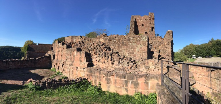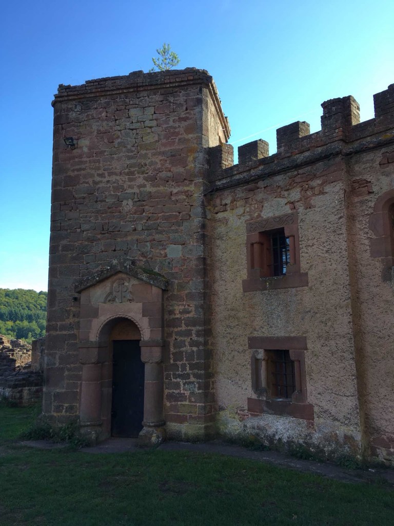 Then we came across the town of Lutzelbourg, above which there loomed some castle ruins. Sophie suggested that we might find we could overnight up there. Whilst this is not in her job description, a Park4night spot did actually appear on my SatNav, so we thought we’d better check it out. The approach road looked a bit tight, so we walked it first to see. Comfortable that we could drive up it and that there was sufficient space to park on the flat, I left Sophie snapping away with her phone, whilst I went and fetched the van. It was a stunning spot, with great views from the castle, and we looked forward to another peaceful night.