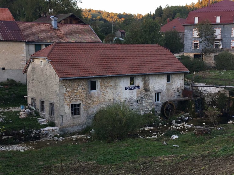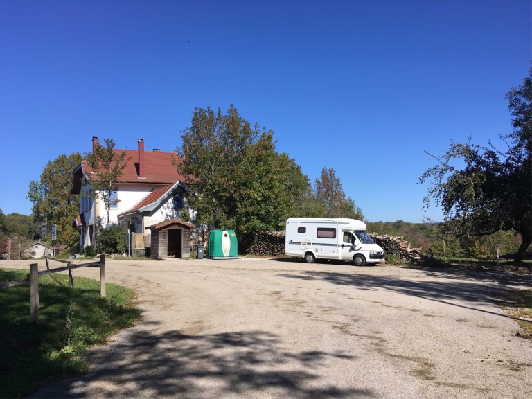 Our spot for the night, thanks to Park4night, turned out to be in the lovely rural parking area for a waterfall and gorge, in the little village of Les Planches en Montagne. We only had one neighbour and the prospect of a very peaceful night.