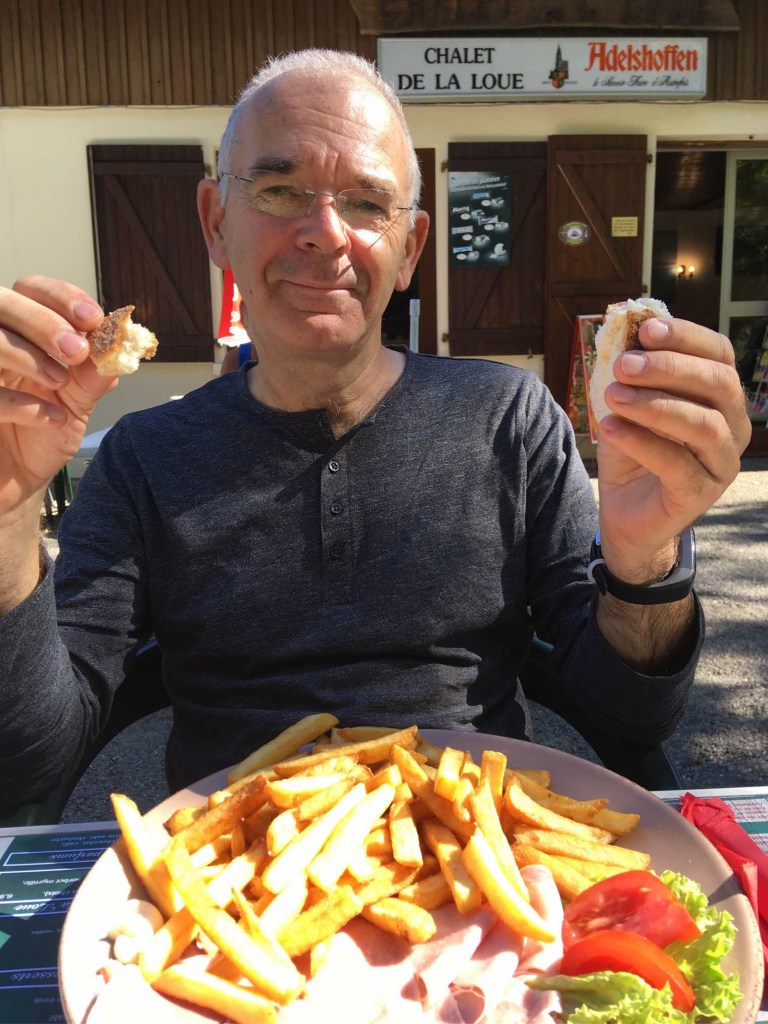 So, smoked ham and chips was next on the agenda, washed down by a small carafe of the house Cotes de Rhône. Actually, this turned out to be one of our favourite meals out.