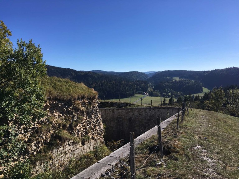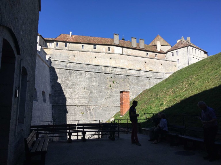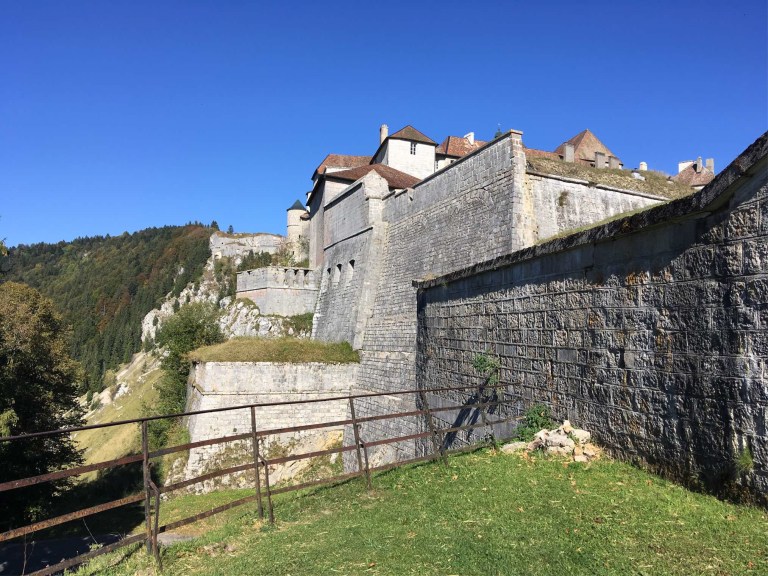 Château de Joux was our next stop, just beyond Pontarlier, and what great views from here. You can even overnight there in a motorhome, but we were carrying on that day. Next, I checked out a “wild-card” Park4night very close to the Swiss border. It had all the usual free motorhome facilities, and beautiful views of hills, perfectly manicured green meadows, pine forest, and cows, but the nearby roads, although not major, seemed too busy to risk. So, after topping up and tipping out, our quest continued.