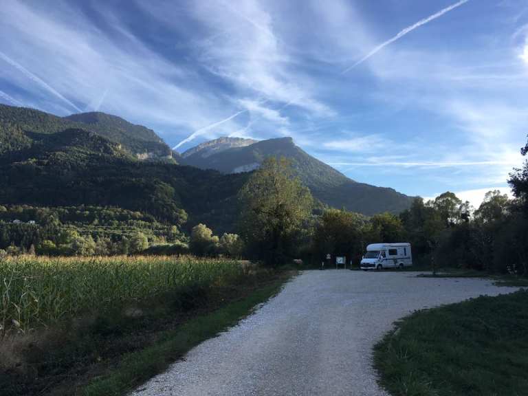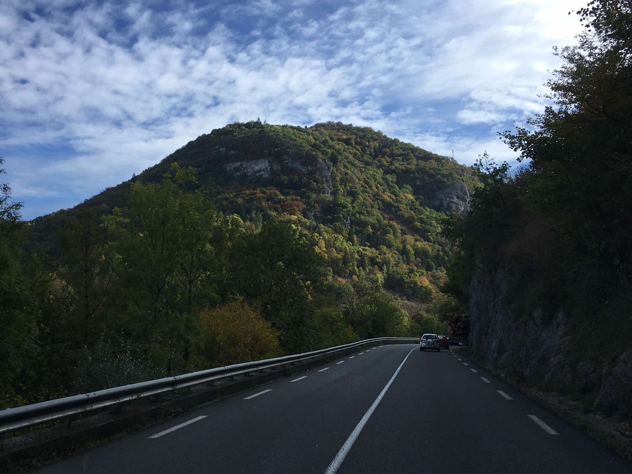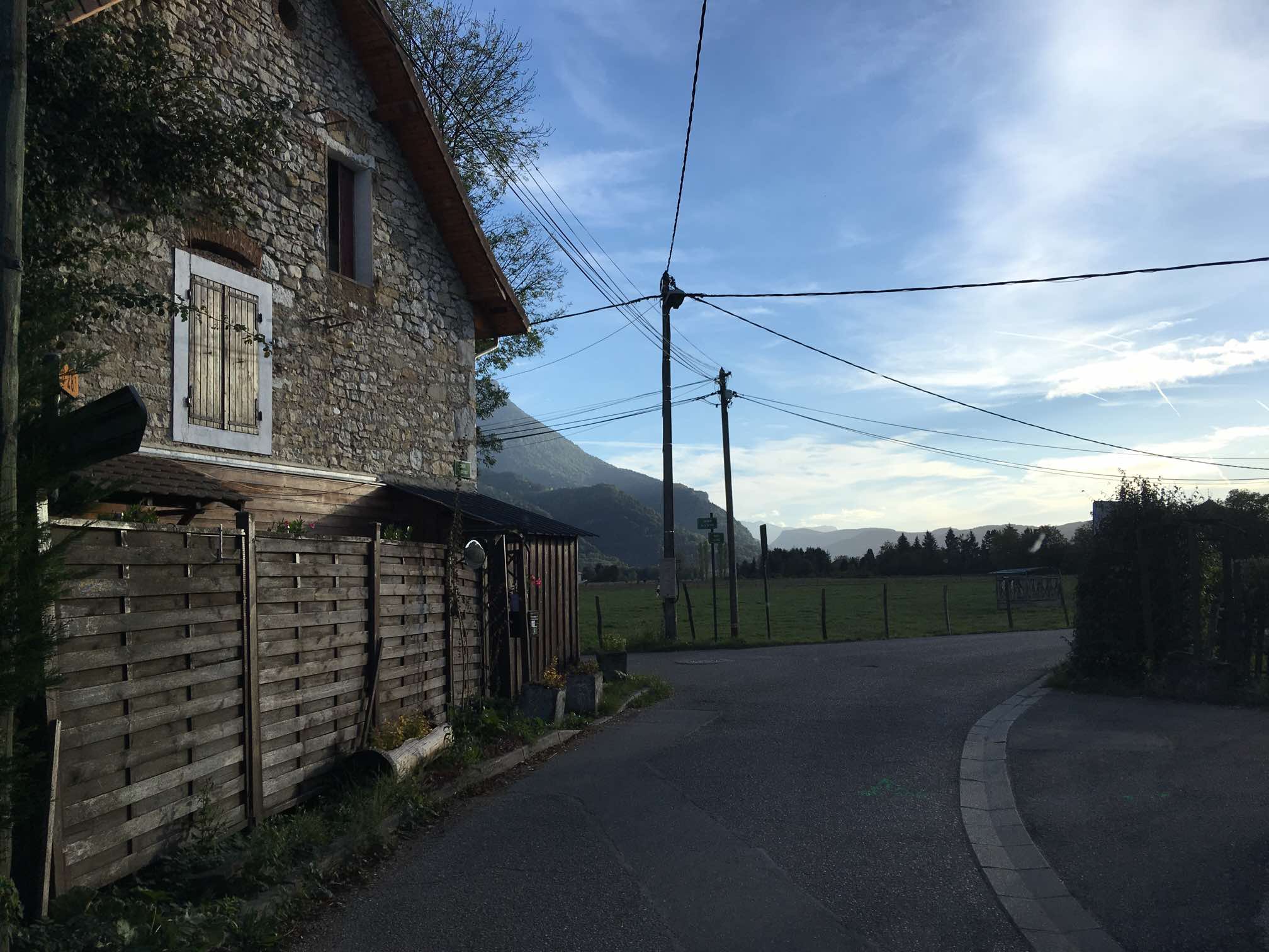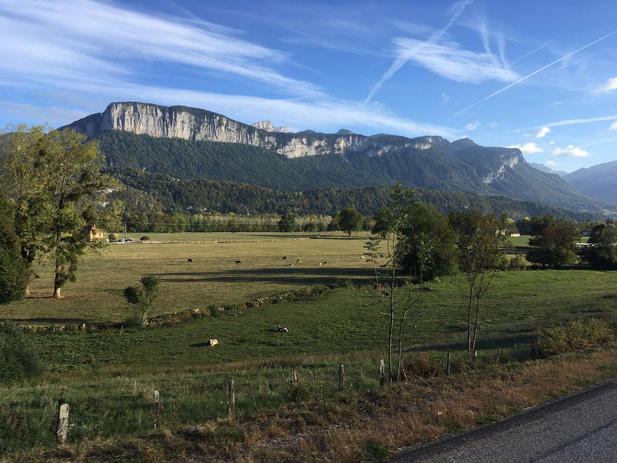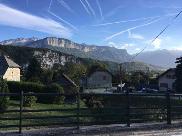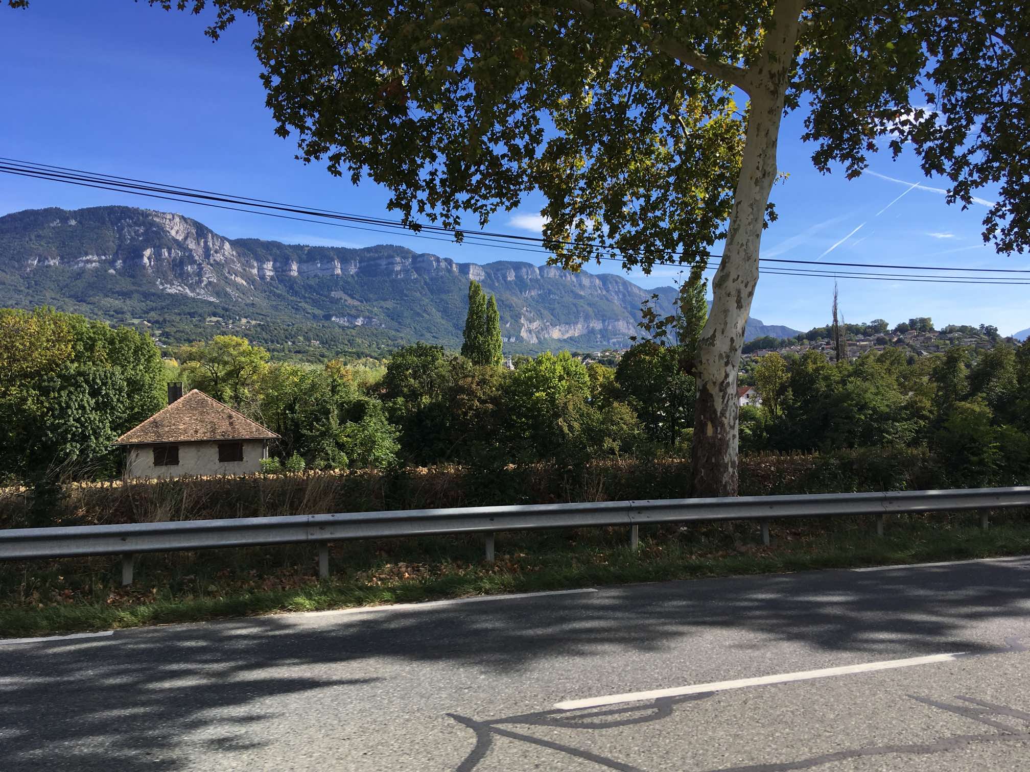After a narrow escape from Chambery, we headed in a Southwesterly direction, and the great mountain views continued. We checked out a couple of potential overnight stops, but very narrow roads, as well as Sophie’s new criterion of not being too close to church bells, led us to carry on to the small village of Les Echelles.