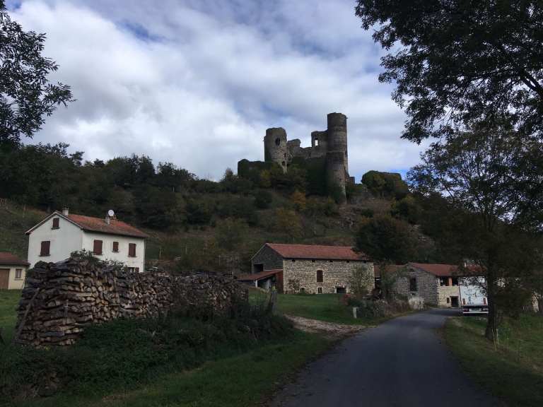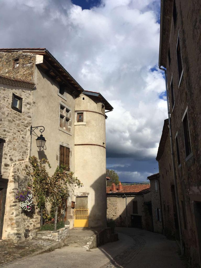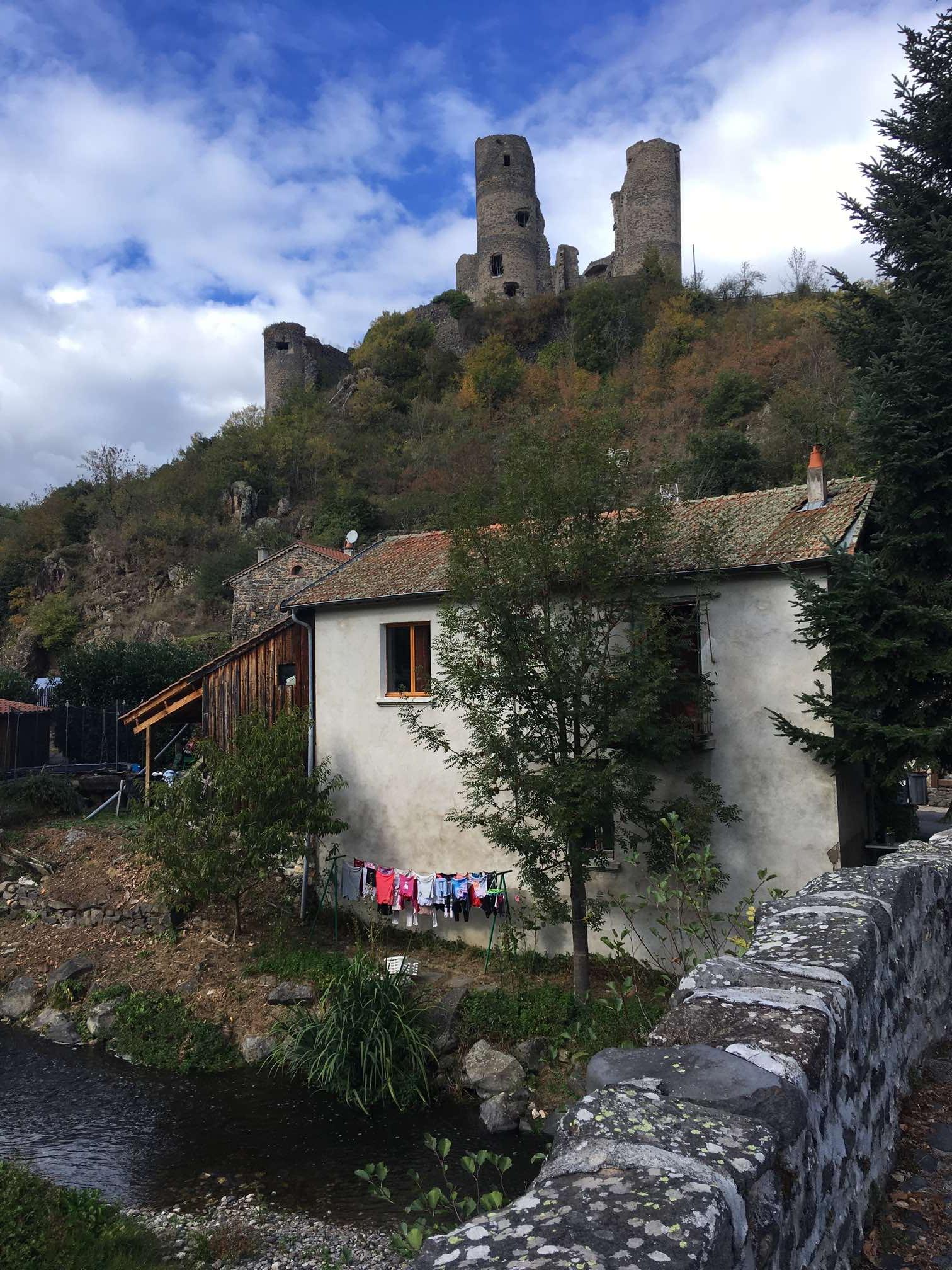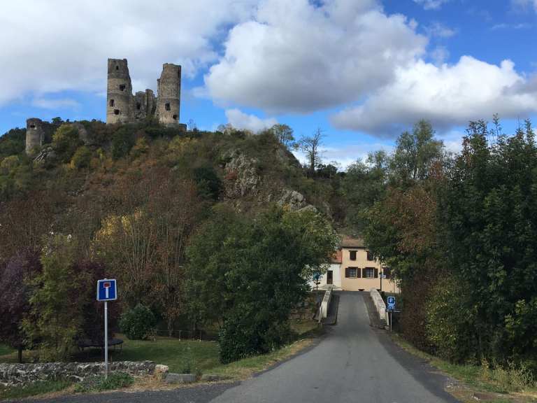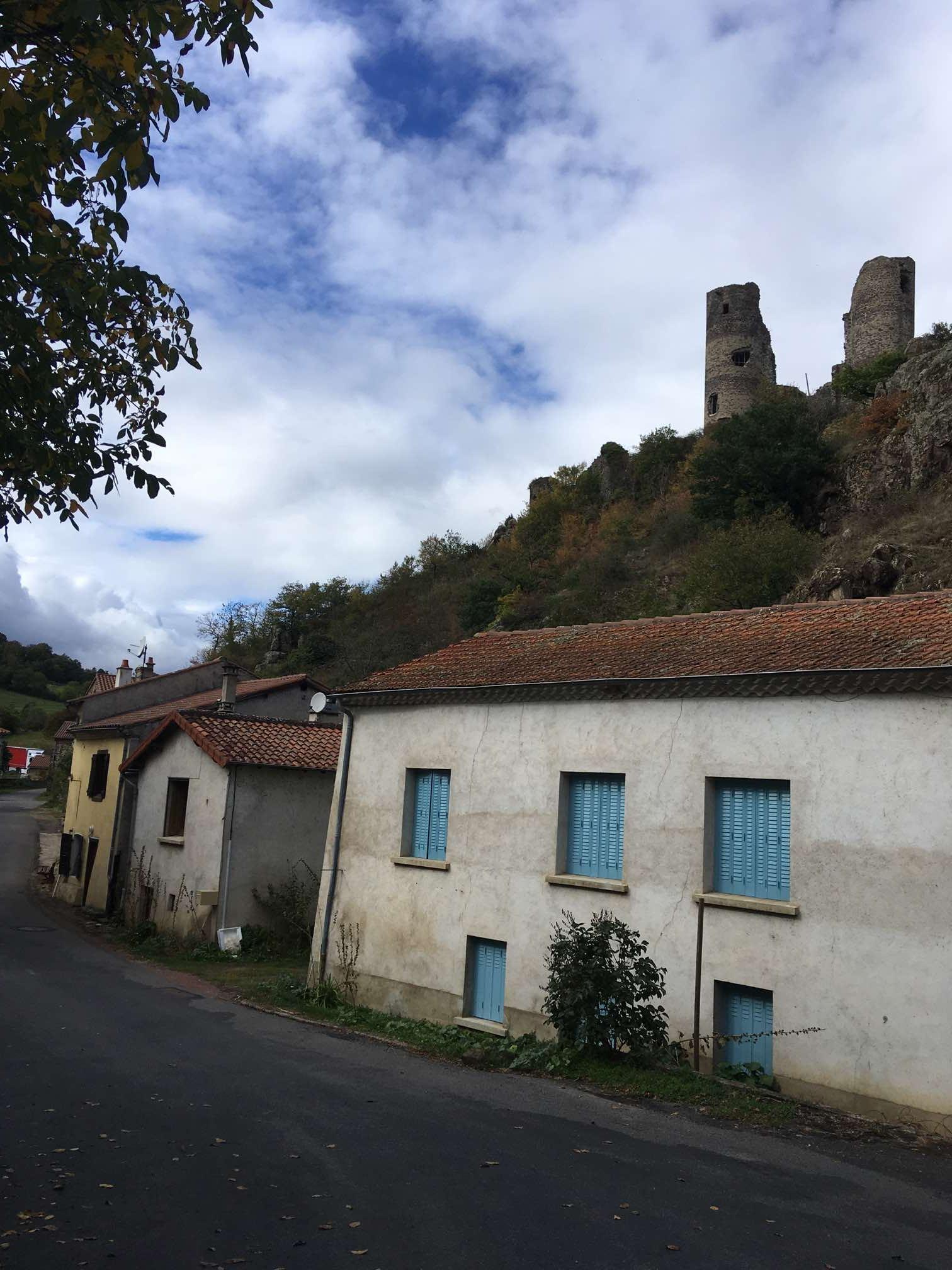 We were soon at Allègre, another lovely hilltop village, with some castle ruins to visit. After tentatively navigating our way up into the town, we found parking in the small central square. Like many villages we’ve visited in France, Spain, and Portugal, there was not a soul in sight and, as always, we agreed that it felt like some post-apocalyptic world where we were the only survivors. This is particularly noticeable between 12 and 2 in France, and, as this was a Sunday, it was even more likely.