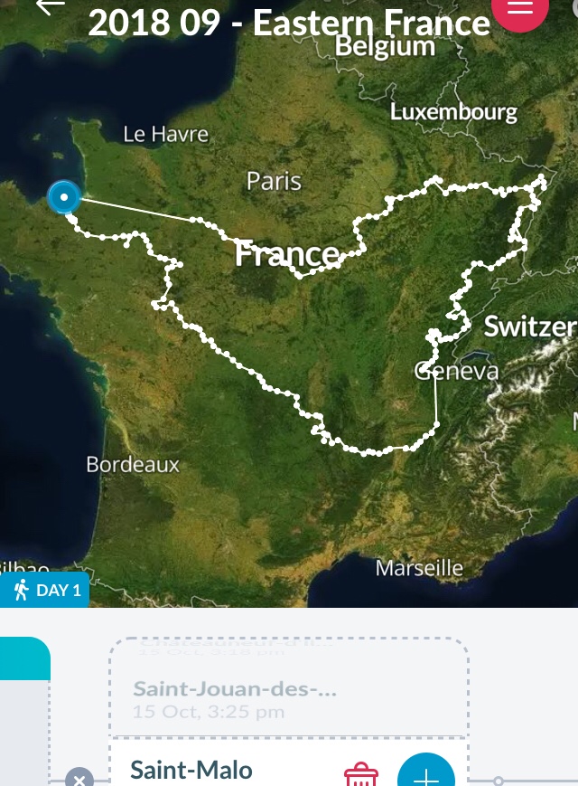 After this it was time to aim for our last overnight of this trip, which would be our old reliable favourite of Hédé. Lots of space and very quiet. The next day we treated ourselves to a lovely set menu with steak and chips at Atypic in Dinan, and after some last minute shopping headed to St Malo for our boat trip home.