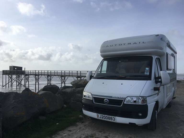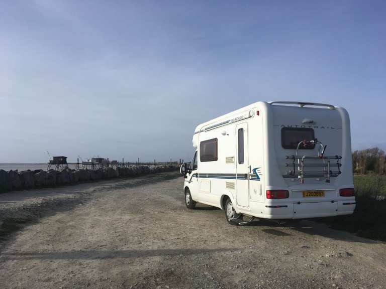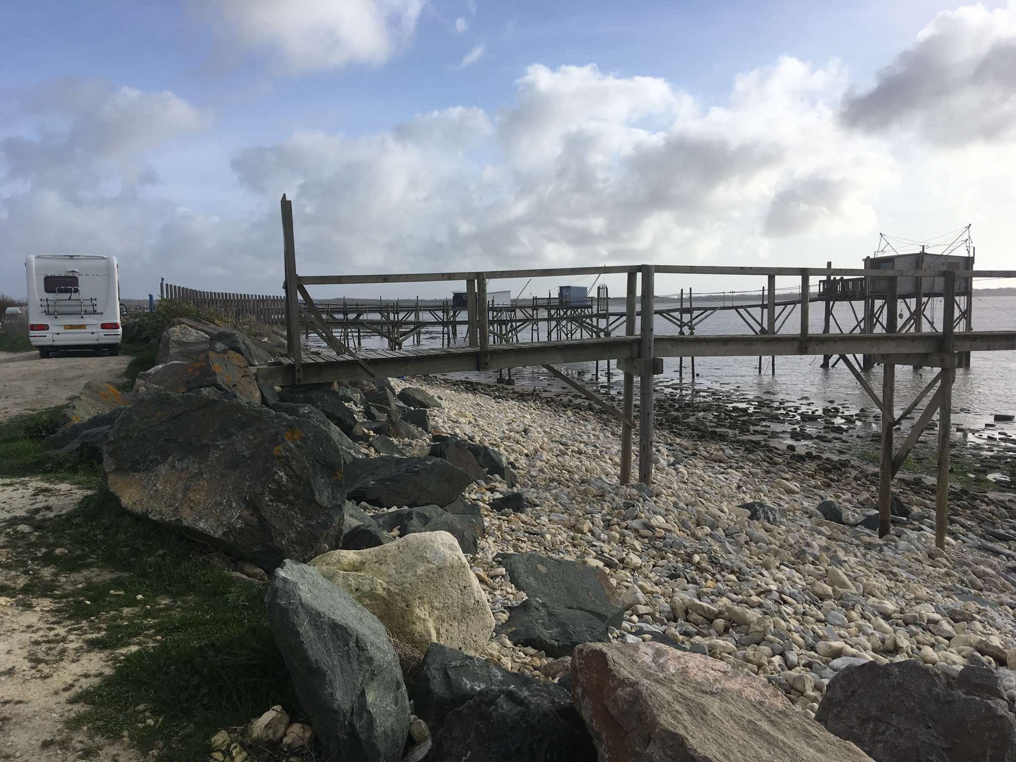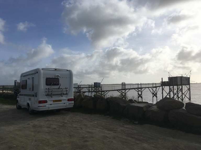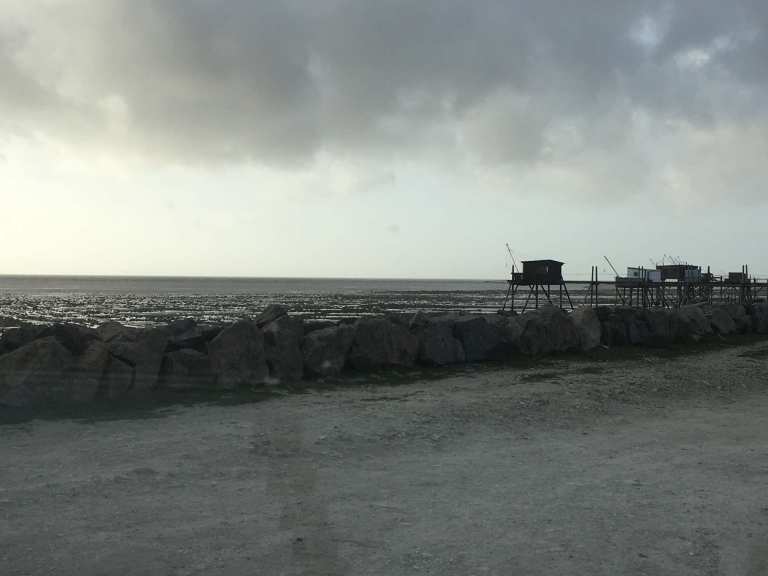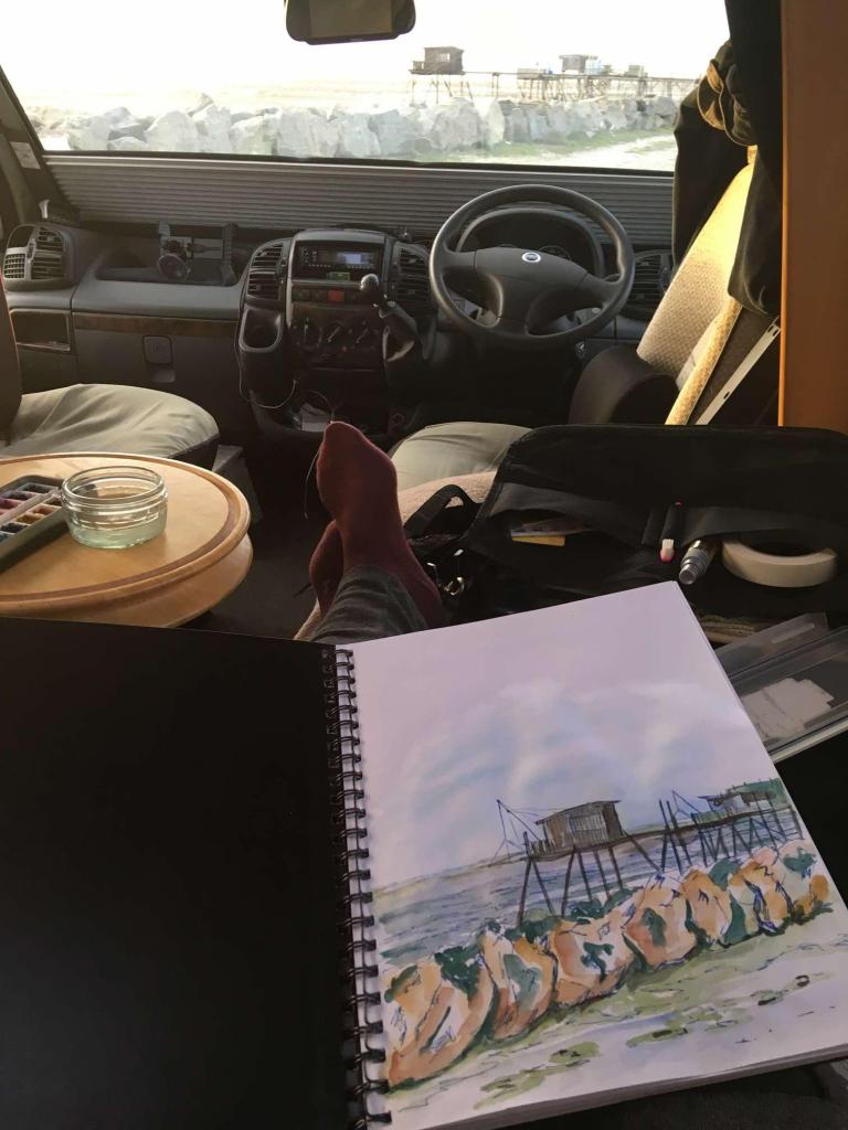 Today it has worked a treat. First one was at La Rochelle, and after finding that one unavailable, a quick check showed a great spot we’d stayed at last year at Yves, just 20km down the coast. So tonight we find ourselves right next to the beach, alongside the region’s typical fishing huts, with their pontoons, and with the sun setting over the sea. Very nice indeed. Sophie has even done an impromptu painting of the view.