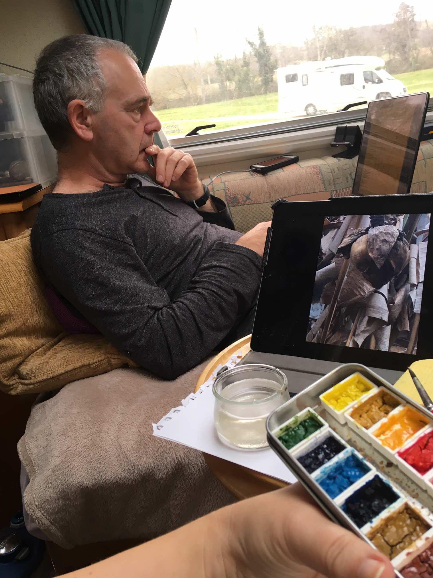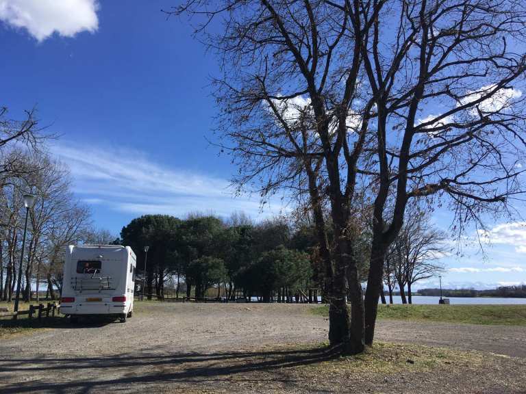 I had more to do on the laptop, whilst Sophie needed to add those important finishing touches to her painting, so en route we found a great Park4night stop next to a lake, with the snow-capped Pyrenees in the background.
