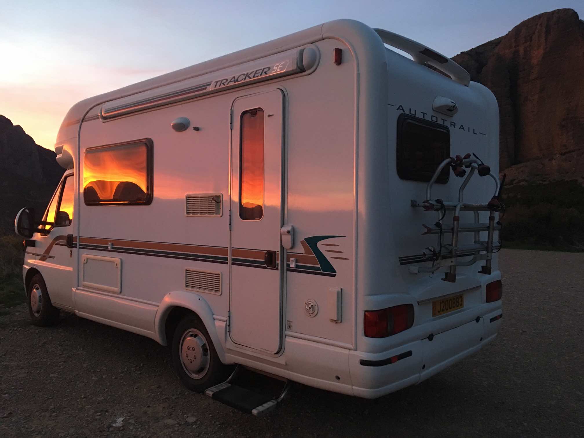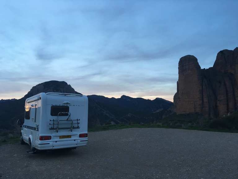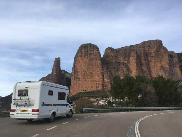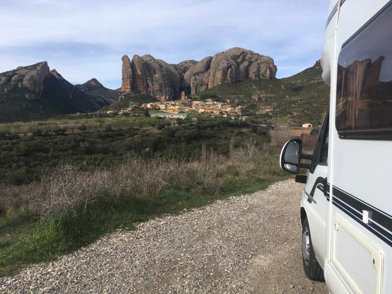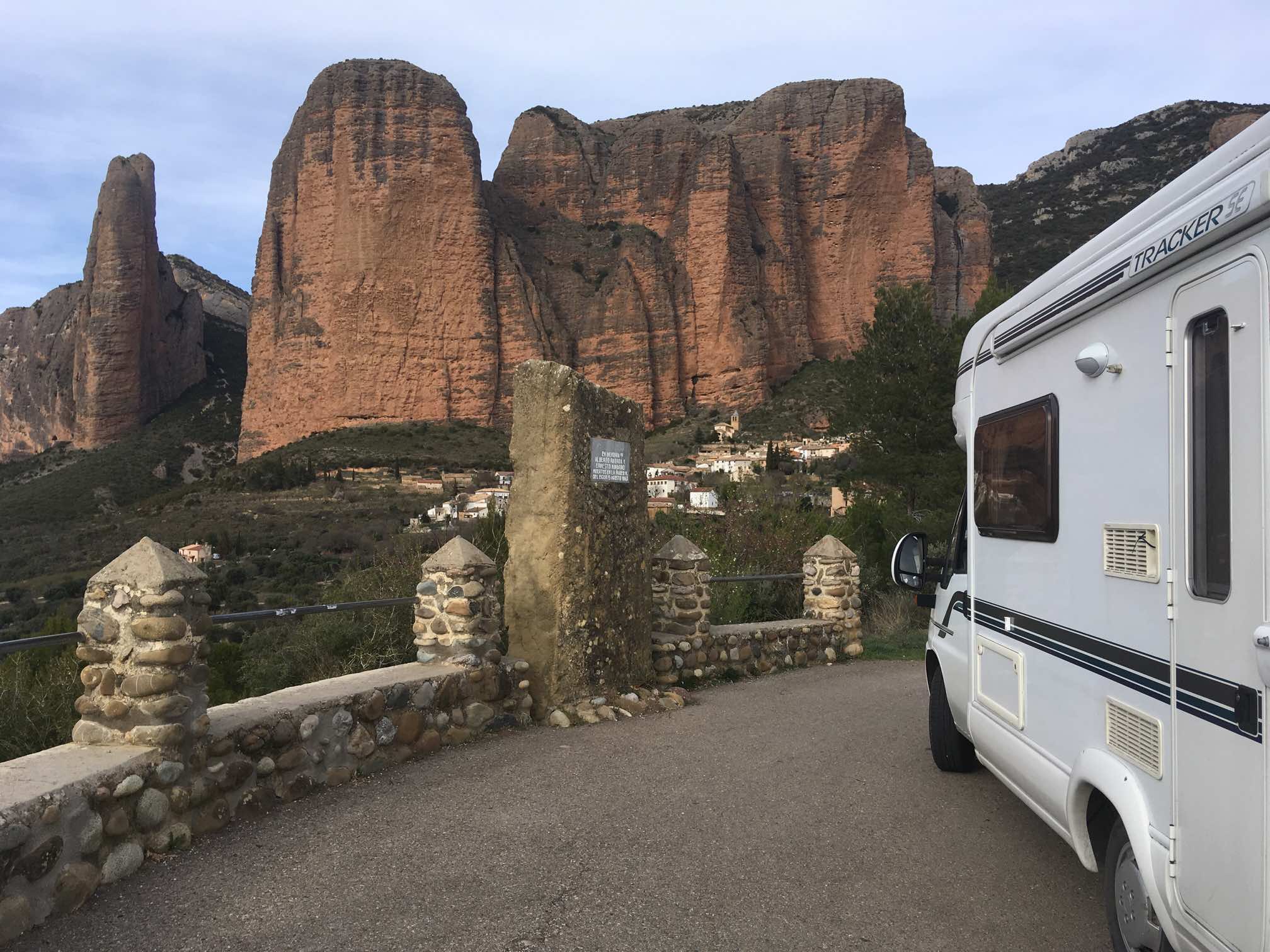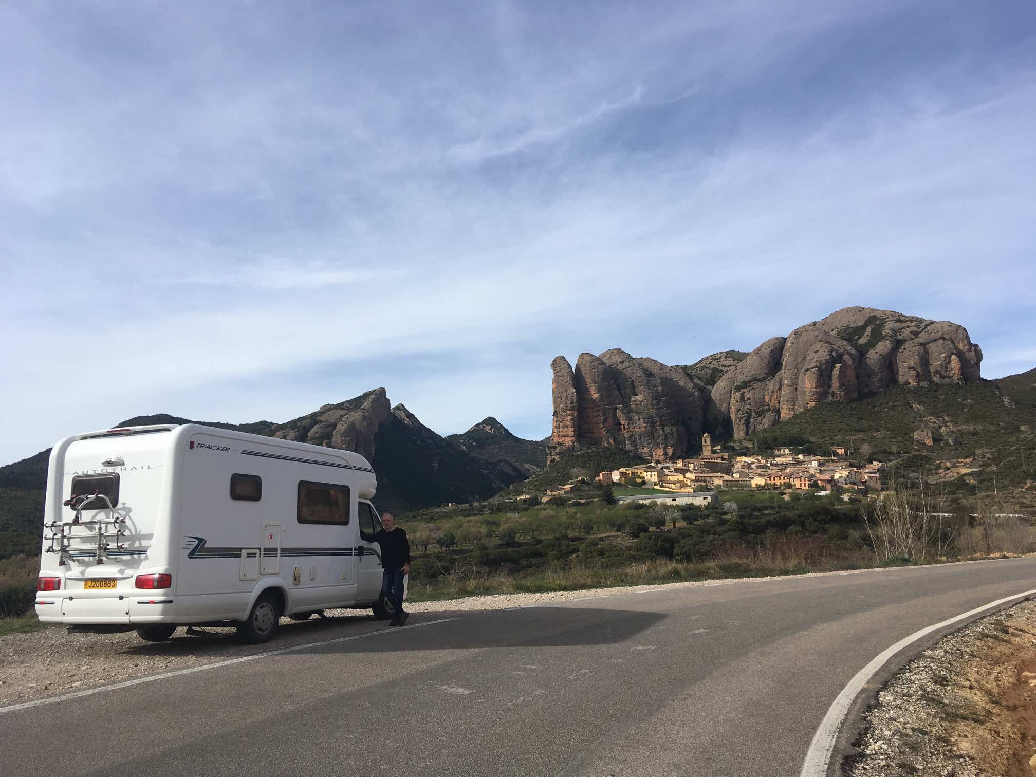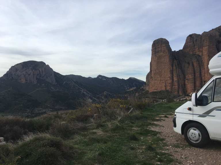 Finally, we headed for another town in a most spectacular setting. Los Mallos de Riglos actually sits right at the foot of those 300m high rock towers, and we’ve parked high up opposite with a spectacular view of the scene and of the valley below. The Park4night we chose has a particularly steep access road, which required first gear most of the way. Anyway, what a place to spend the night. Well worth it.