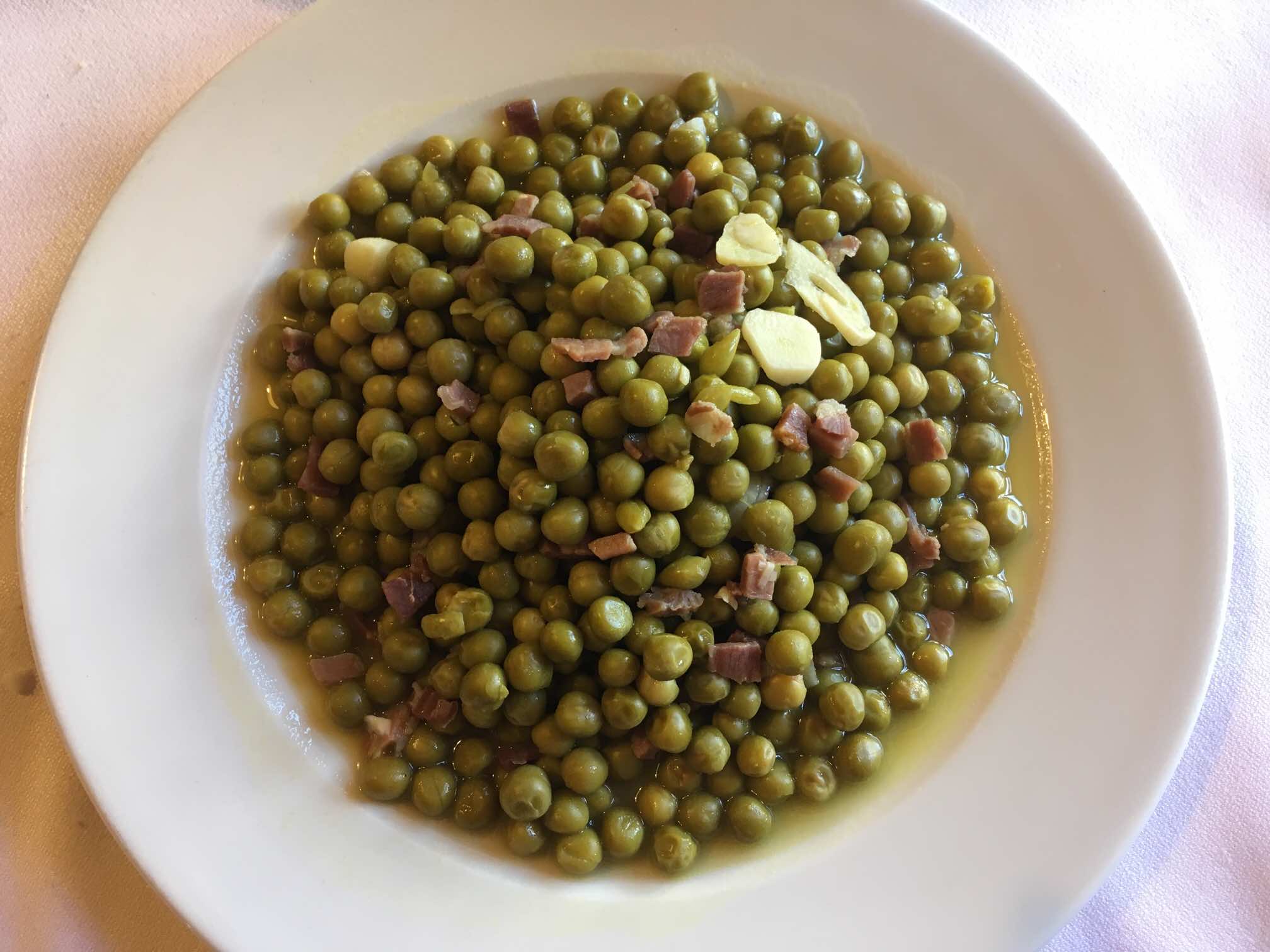 The set menu that included those beans as a starter with the suckling pig as a main, as well as a bottle of wine, and dessert and coffee, caught my eye. The beans were great. For some reason Sophie chose a plate of peas, with a few bits of ham with them, so her mistake meant that she tucked into my lovely beans as well.