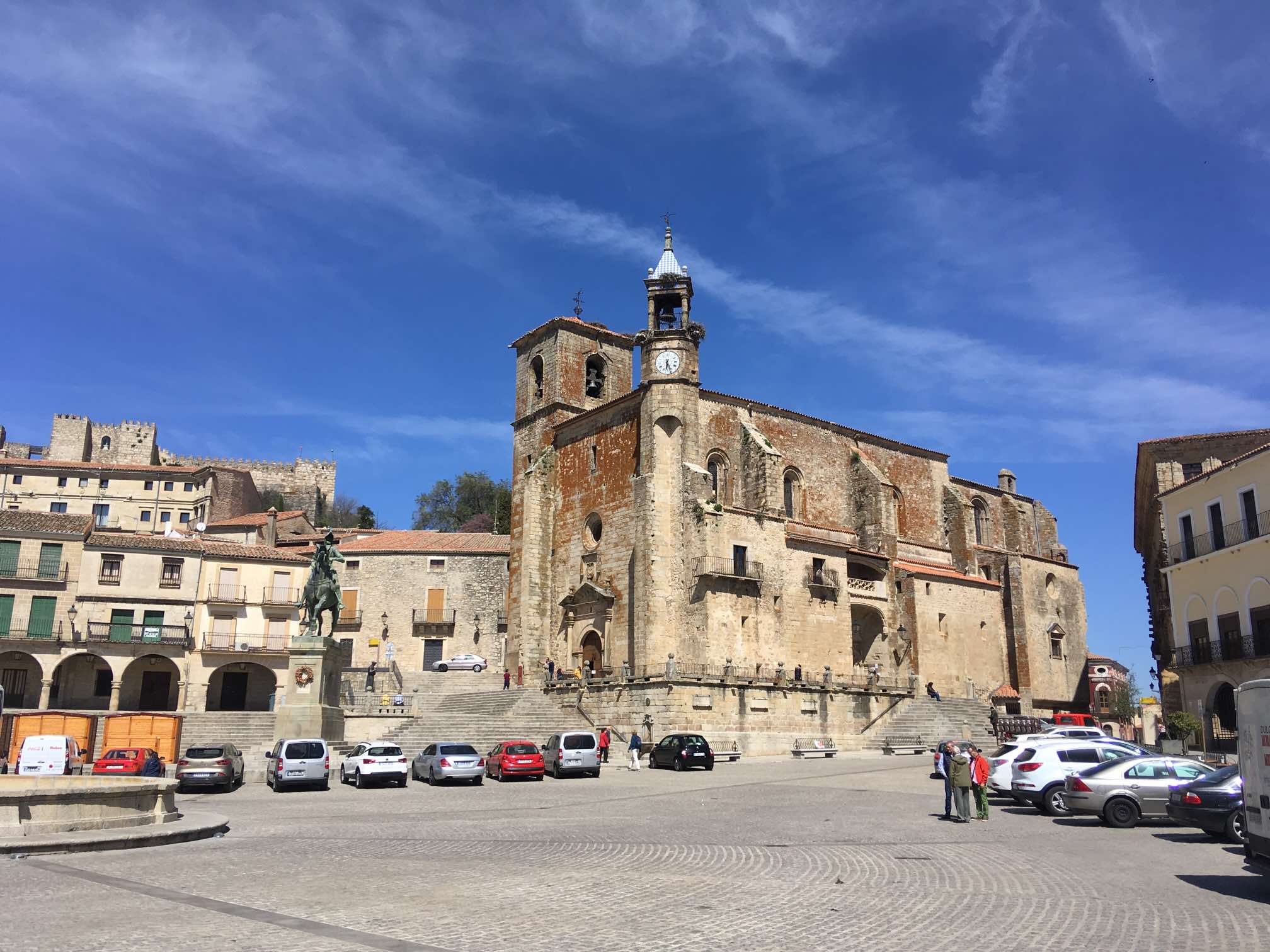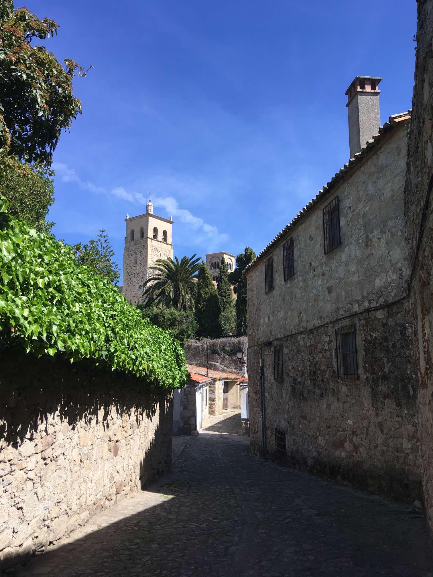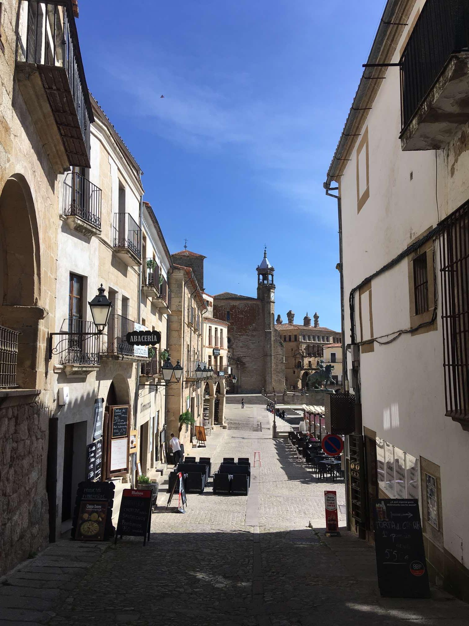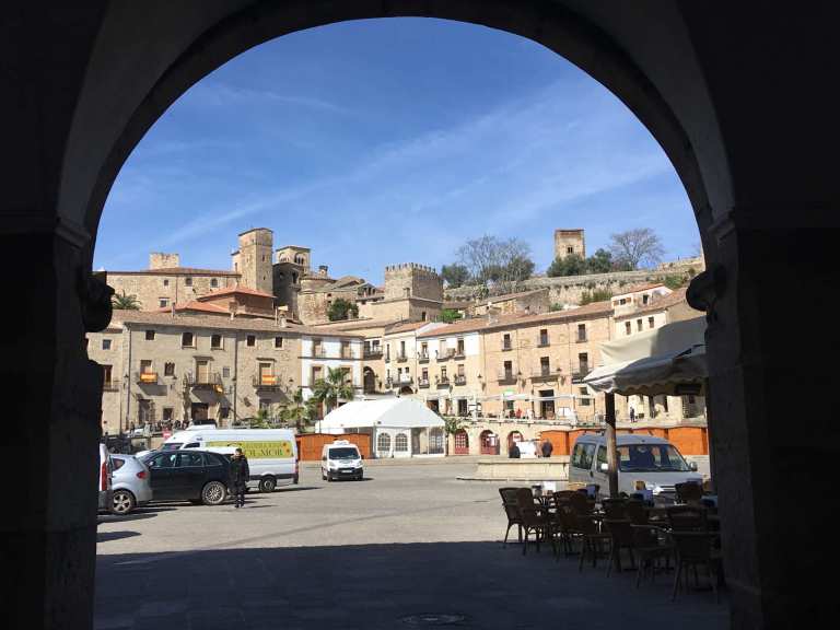 It was roughly a 10 minute stroll uphill to the main square, where we found some steps in the shade to sit on and work out where to go next. I whipped out the iPad because I’d downloaded the Lonely Planet’s Best Drives in Spain & Portugal onto it. I found the reference to Caceres, and immediately read that the steps opposite that lead off from the square take you off into a classic medieval part of the town. Most definitely worth a visit in my view.
