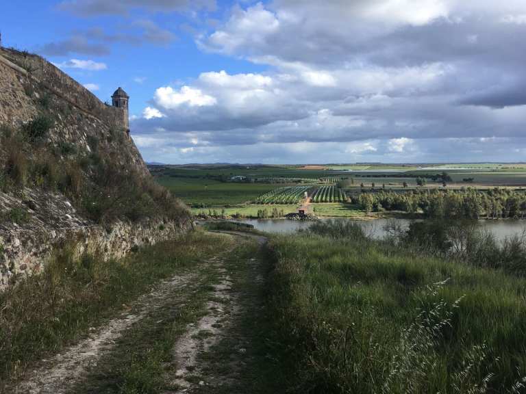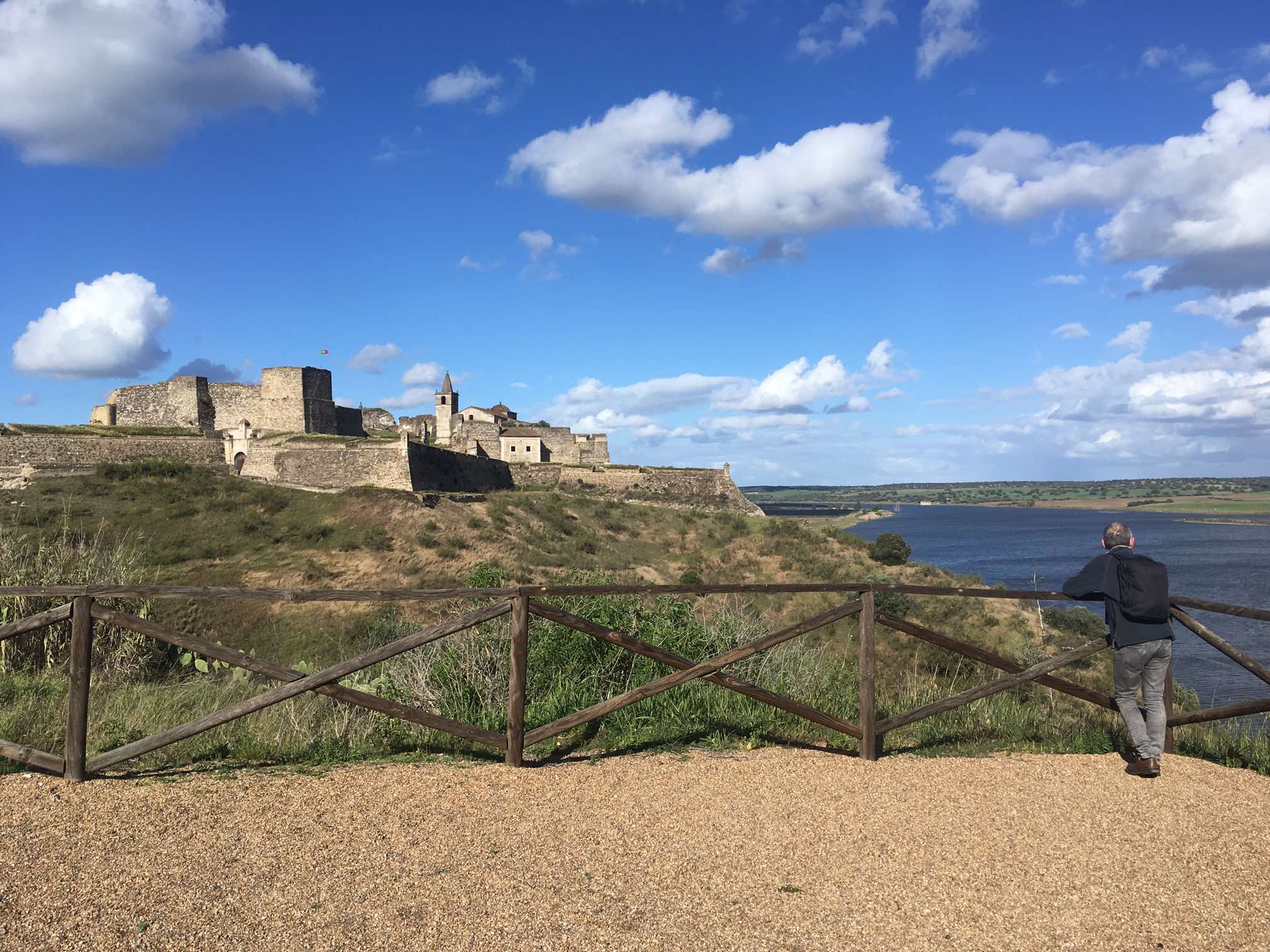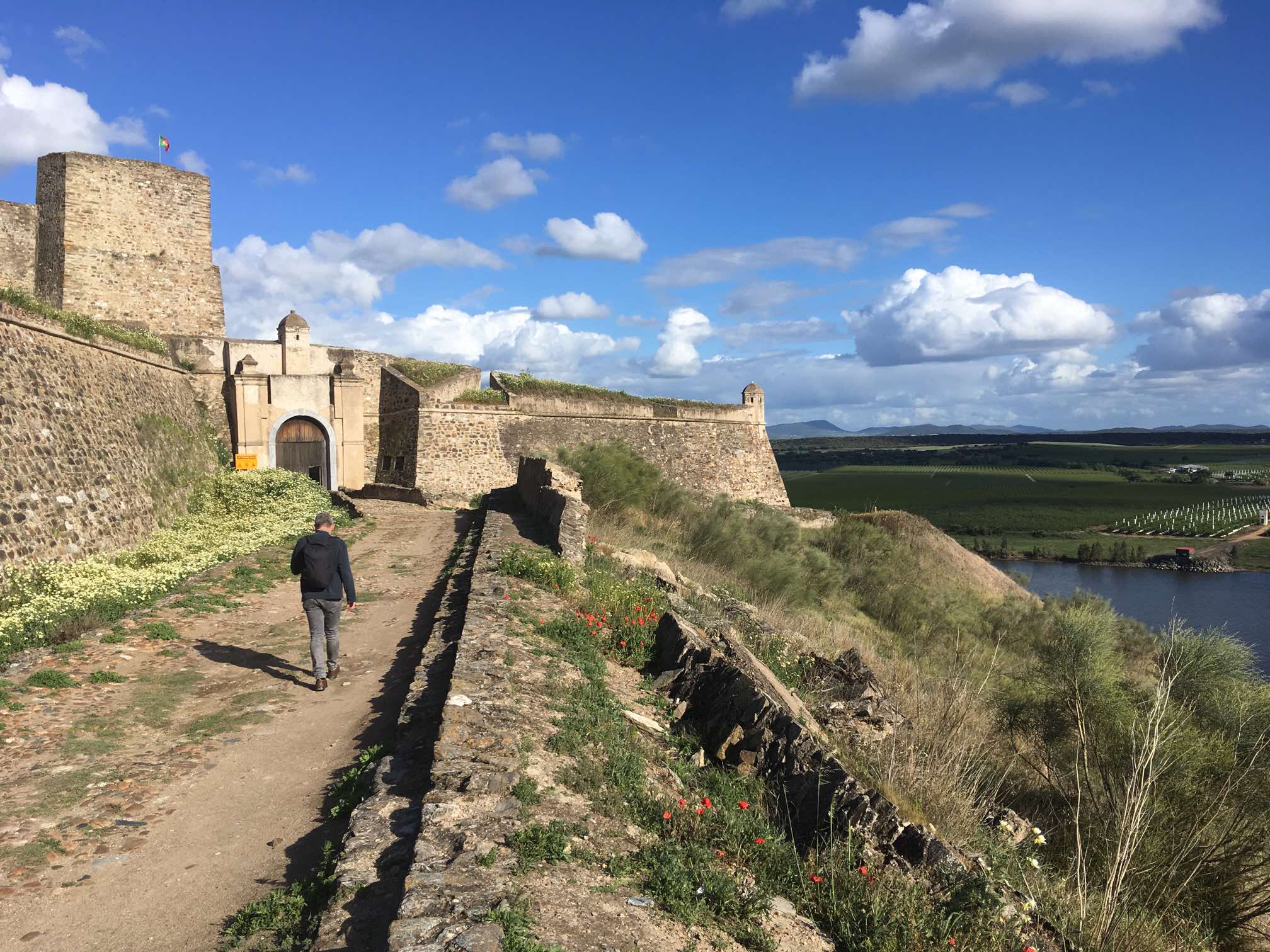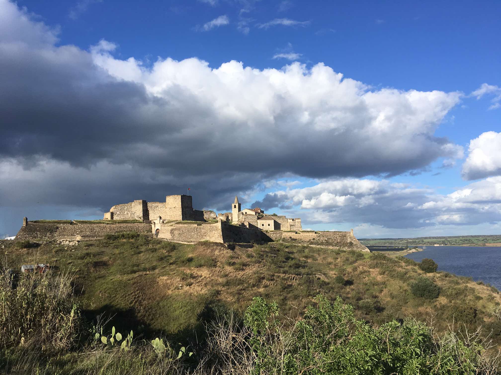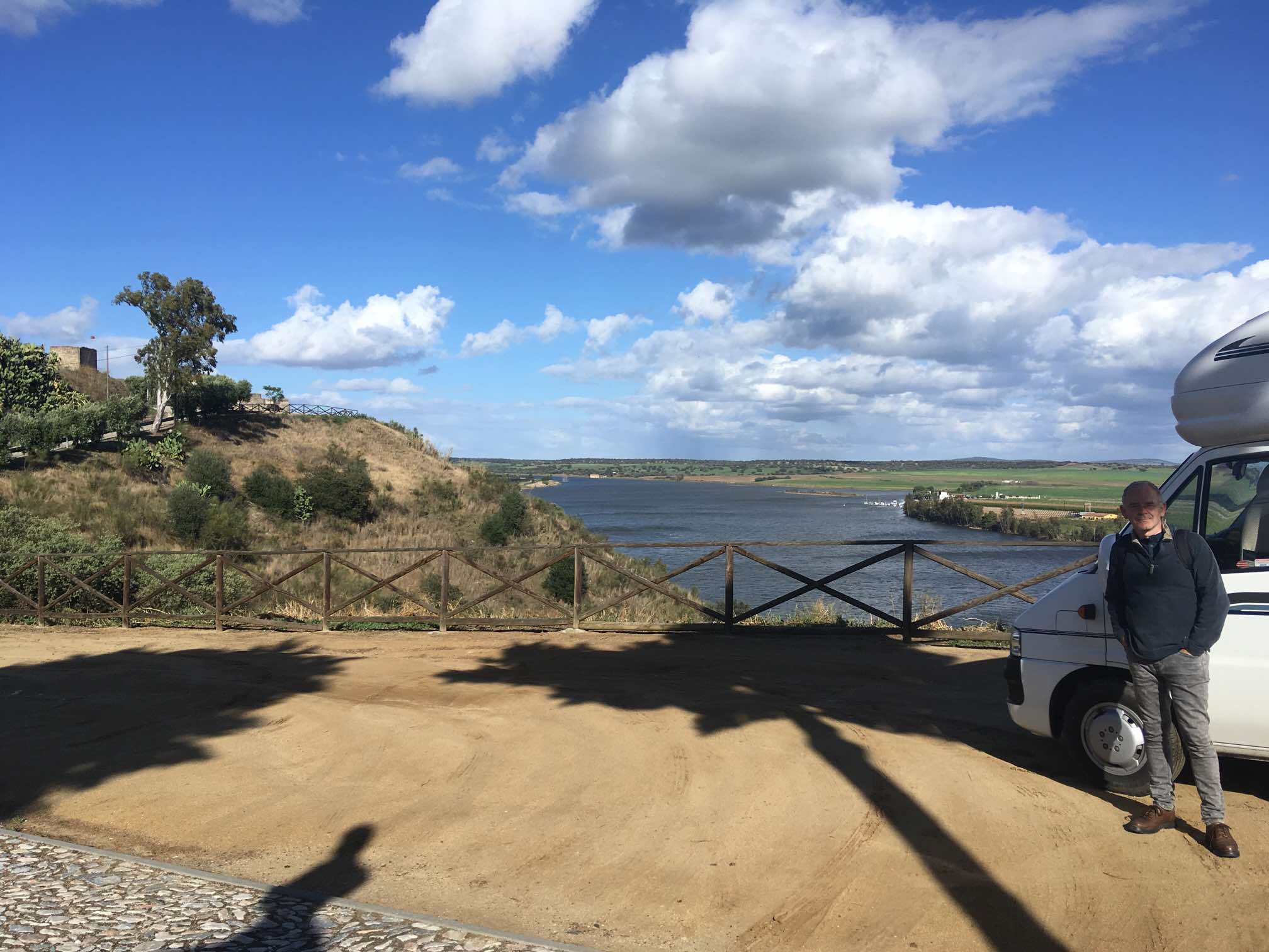 I’d been aiming for a Park4Night at Juromenha, a small fortified town right opposite the Spanish border. The parking is coincidentally next to another cemetery, and overlooks the Guadiana river that separates these two countries. We’re in an elevated position and our main view is of Spain, just across the water.