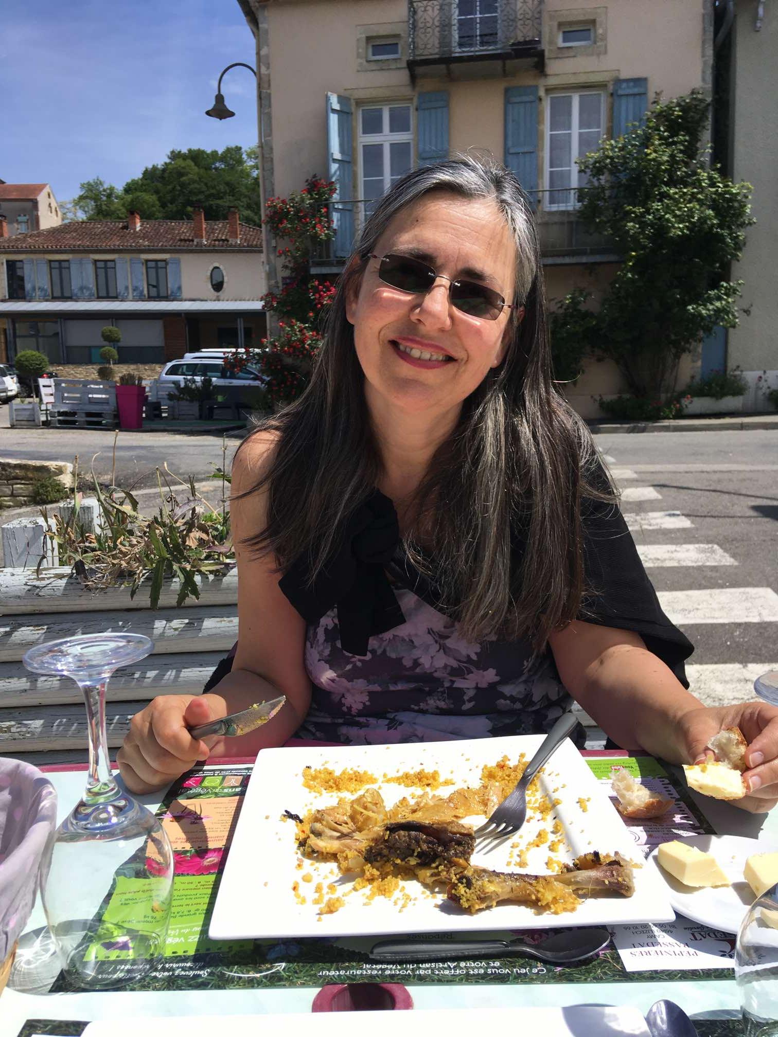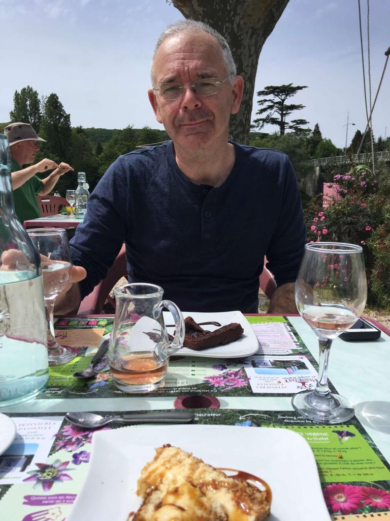 We were pushing our luck to get lunch at gone 1:30pm, and despite the proprietor’s sucking in air through her teeth, Sophie persuaded her to feed us. I wasn’t totally sure what she offered us, but we knew it wouldn’t cost much, and were lunching outside in the sun anyway, so who cares. Can’t remember when we last did that. As it happened, we were served one Moroccan style chicken with couscous, and one vegetable quiche. I’m not sure how she did it but like a magician Sophie managed to make the chicken appear in front of her and there was no mention of the rule that we halve dishes to be fair 🙄.