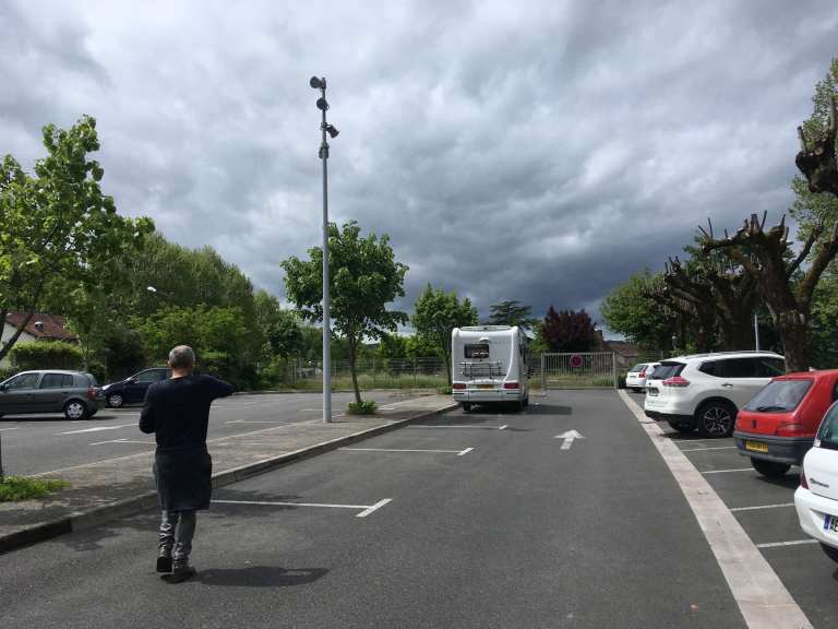 We contemplated staying in their very ample central parking, but first we checked out a Park4night near to a lake. The entry on the app only showed one photograph of a grassy area, which is not the ideal surface when there’s so much rain about, but on arrival we could see that actually there was firm parking alongside. So here we are, lakeside, in the company of several fisherman. Hopefully should be a good spot.